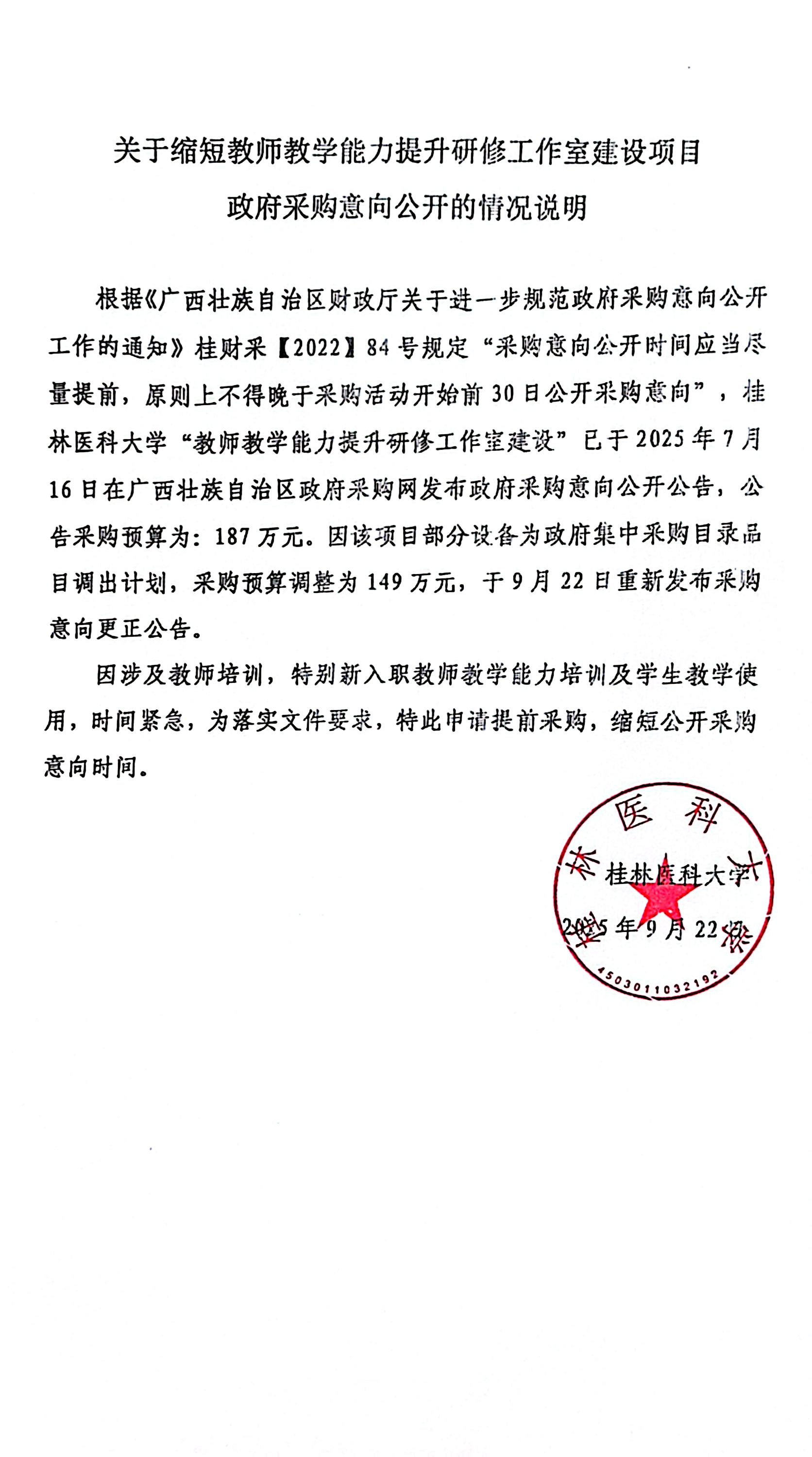 公告概要:公告信息: | 采购项目名称 | 桂林医科大学教师教学能力提升研修工作室建设 | 品目 | | 采购单位 | 桂林医科大学 | 行政区域 | 广西壮族自治区 | 公告时间 | 2025年09月23日 15:16 | 获取采购文件的地点 | 广西政府采购云平台 (https://www.gcy.zfcg.gxzf.gov.cn) | 获取采购文件时间 | 详见公告正文 | 预算金额 | ¥149.000000万元(人民币) | 联系人及联系方式: | 项目联系人 | 曾昭卉、栗晓奇 | 项目联系电话 | 0773-3696789转2 | 采购单位 | 桂林医科大学 | 采购单位地址 | 桂林市临桂区致远路1号 | 采购单位联系方式 | 0773-3662950 | 代理机构名称 | 广西机电设备招标有限公司 | 代理机构地址 | 桂林市七星区骖鸾路31号湘商大厦603(桂林分公司) | 代理机构联系方式 | 0773-3696789转2 |
