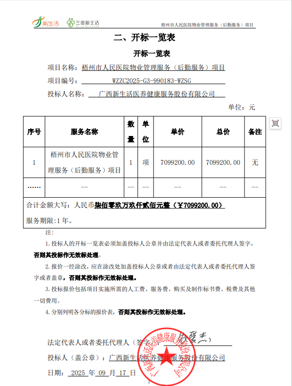 一、项目编号:WZZC2025-G3-990183-WZSG 二、项目名称:梧州市人民医院物业管理服务(后勤服务)项目 三、中标(成交)信息 1.中标结果: | 序号 | 中标(成交)金额(元) | 中标供应商名称 | 中标供应商地址 | | 1 | 报价:7099200(元) | 广西新生活医养健康服务股份有限公司 | 南宁市高新区新际路10号南宁东盟企业总部港E2栋十二层Y12-01室 |