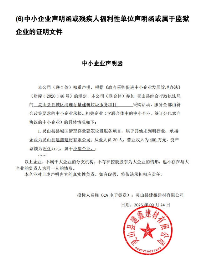 公告概要:| 公告信息: | | 采购项目名称 | 灵山县县城区清理存量建筑垃圾服务项目 | | 品目 | | | 采购单位 | 灵山县综合行政执法局 | | 行政区域 | 广西壮族自治区 | 公告时间 | 2025年09月25日 08:55 | | 评审专家(单一来源采购人员)名单 | 郭荣兵(第1分标采购人代表),黄金静,何世聪 | | 总成交金额 | ¥0.000000 万元(人民币) | | 联系人及联系方式: | | 项目联系人 | 潘冬梅 | | 项目联系电话 | 0777-6898828 | | 采购单位 | 灵山县综合行政执法局 | | 采购单位地址 | 灵山县灵城镇江滨一路 | | 采购单位联系方式 | 0777-6520990 | | 代理机构名称 | 中鸿同创项目管理有限公司 | | 代理机构地址 | 灵山县三海街道双鹤二路11号 | | 代理机构联系方式 | 0777-6898828 |