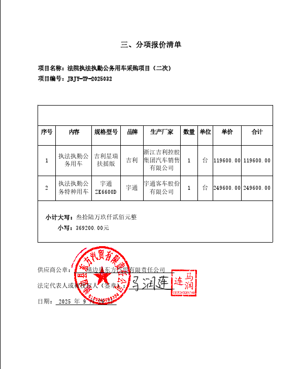 一、项目编号:JBJY-TP-2025032 二、项目名称:法院执法执勤公务用车采购项目(二次) 三、采购结果 采购包1: | 供应商名称 | 供应商地址 | 中标(成交)金额 | 评审价格 | | 靖边县东方汽贸有限责任公司 | 陕西省榆林市靖边县张家畔镇民生路南侧21号 | 334,000.00元 | 334,000.00元 | 四、主要标的信息 合同包1(法院执法执勤公务用车采购项目): 货物类(靖边县东方汽贸有限责任公司) | 品目号 | 品目名称 | 采购标的 | 品牌 | 规格型号 | 数量(单位) | 单价(元) | 总价(元) | | 1 | 轿车 | 执法执勤轿车1辆 | 吉利 | 详见清单 | 1.00(辆) | 99,000.00 | 99,000.00 | | 1 | 其他乘用车 | 执法执勤特种用车1辆 | 宇通 | 详见清单 | 1.00(辆) | 235,000.00 | 235,000.00 | 五、评审专家(单一来源采购人员)名单: 六、代理服务收费标准及金额: | 代理服务收费标准及金额 | | | 合同包号 | 合同包名称 | 代理服务费金额(万元) | 收取对象 | | 1 | 法院执法执勤公务用车采购项目 | 0 | 无 | 七、公告期限 自本公告发布之日起1个工作日。 八、其他补充事宜 九、凡对本次公告内容提出询问,请按以下方式联系。 1.采购人信息 名称:靖边县人民法院 地址:陕西省榆林市靖边县新区文化路 联系方式:15667721111 2.采购代理机构信息 名称:靖边县县级政府采购中心 地址:陕西省榆林市靖边县统万路120号 联系方式:0912-4636977 转 8002 3.项目联系方式 项目联系人:冯二通、李春雨 电话:15667721111、0912-4636977 转 8002 靖边县县级政府采购中心 2025年09月28日 |