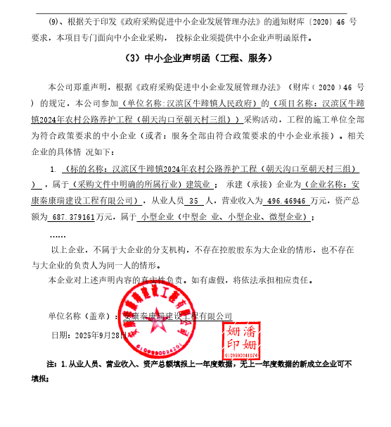 公告概要:公告信息: | 采购项目名称 | 汉滨区牛蹄镇2024年农村公路养护工程(朝天沟口至朝天村三组) | 品目 | | 采购单位 | 汉滨区牛蹄镇人民政府 | 行政区域 | 汉滨区 | 公告时间 | 2025年09月29日 11:53 | 评审专家(单一来源采购人员)名单 | 梁世荣,邓锋梅,徐方国 | 总成交金额 | ¥95.580000 万元(人民币) | 联系人及联系方式: | 项目联系人 | 李工 | 项目联系电话 | 0915-3366619 | 采购单位 | 汉滨区牛蹄镇人民政府 | 采购单位地址 | 汉滨区牛蹄镇牛蹄街道 | 采购单位联系方式 | 13309153775 | 代理机构名称 | 安康永正建通项目管理有限公司 | 代理机构地址 | 陕西省安康市汉滨区陕西省安康市汉滨区阳光丽都C座1302室 | 代理机构联系方式 | 0915-3366619 | 附件: | 附件1 | 汉滨区牛蹄镇人民政府汉滨区牛蹄镇2024年农村公路养护工程(朝天沟口至朝天村三组)中标(成交)明细.pdf | 附件2 | 中小企业声明函.png |