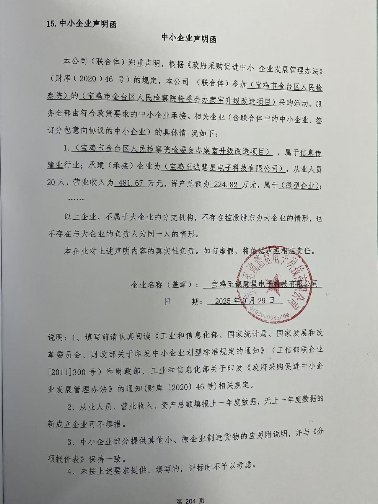 公告概要:公告信息: | 采购项目名称 | 宝鸡市金台人民检察院检委会办案室升级改造项目 | 品目 | | 采购单位 | 金台区人民检察院 | 行政区域 | 宝鸡市 | 公告时间 | 2025年09月30日 09:15 | 评审专家(单一来源采购人员)名单 | 谢宏安,陈伟涛,苏芳婷 | 总成交金额 | ¥24.800000 万元(人民币) | 联系人及联系方式: | 项目联系人 | 范卓雅 | 项目联系电话 | 15229872307 | 采购单位 | 金台区人民检察院 | 采购单位地址 | 宝鸡市东风路9号 | 采购单位联系方式 | 0917-3102042 | 代理机构名称 | 陕西宇图博咨询管理有限公司 | 代理机构地址 | 宝鸡市金台区鹏博财富中心5号楼A座1202室 | 代理机构联系方式 | 15229872307 | 附件: | 附件1 | 中小企业声明函.jpg | 附件2 | 9.22招标文件定稿.pdf | 附件3 | 金台区人民检察院宝鸡市金台人民检察院检委会办案室升级改造项目中标(成交)明细.pdf |