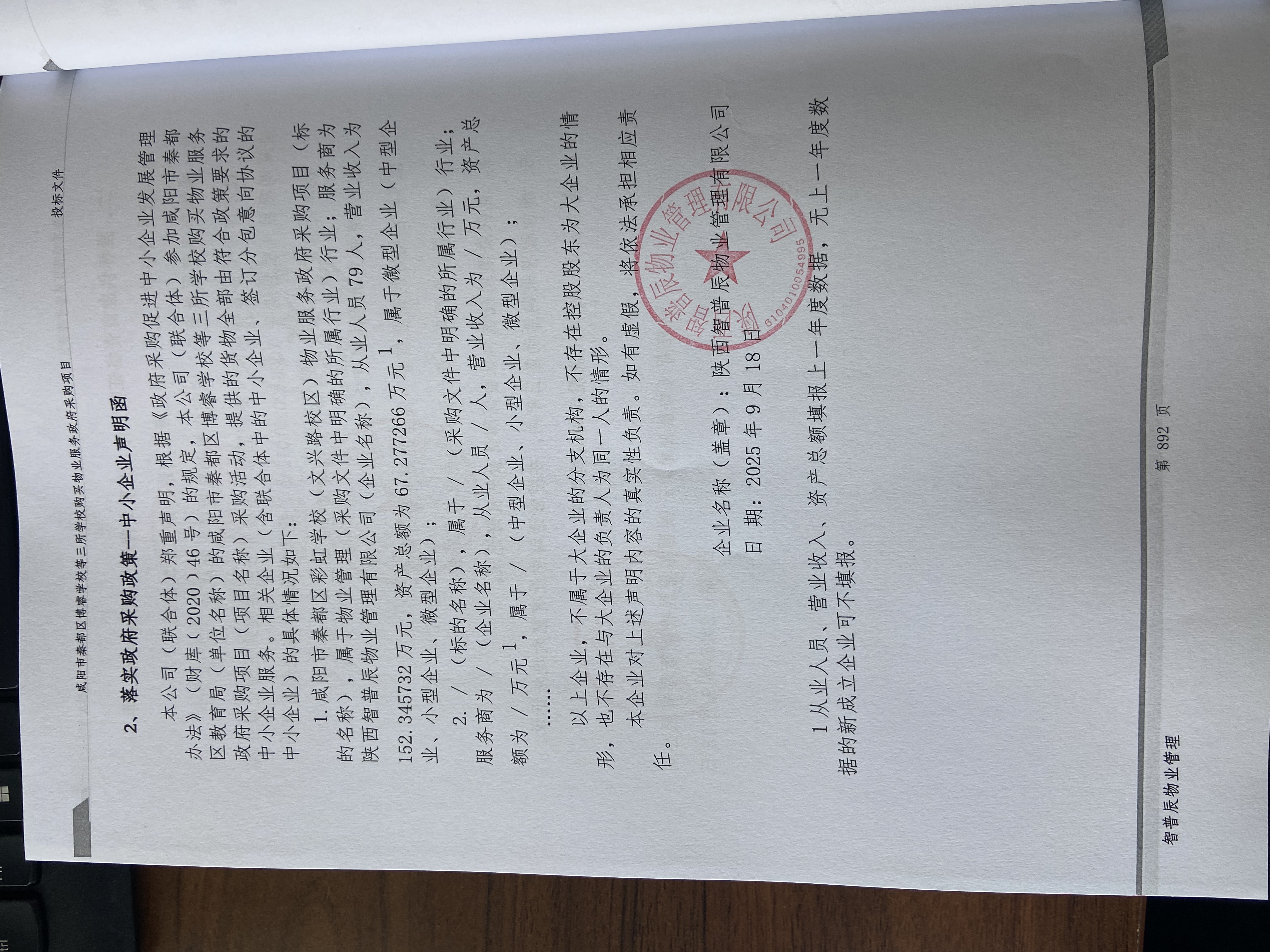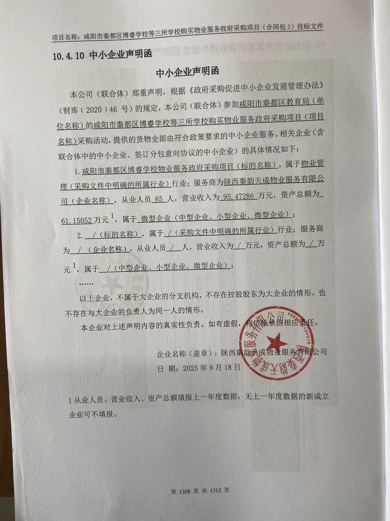 公告概要:公告信息: | 采购项目名称 | 秦都区博睿等三所学校购买物业服务政府采购项目 | 品目 | | 采购单位 | 咸阳市秦都区教育局 | 行政区域 | 秦都区 | 公告时间 | 2025年09月30日 10:43 | 评审专家名单 | 王雪宁,朱宏伟,郭小娣,殷群玲,马磊 | 总中标金额 | ¥128.041300 万元(人民币) | 联系人及联系方式: | 项目联系人 | 郭先生 | 项目联系电话 | 029-33213950 | 采购单位 | 咸阳市秦都区教育局 | 采购单位地址 | 咸阳市秦都区咸通南路 | 采购单位联系方式 | 029-33372636 | 代理机构名称 | 咸阳市秦都区政府采购中心 | 代理机构地址 | 咸阳市秦都区渭阳中路1号秦都区政府南楼8楼821室 | 代理机构联系方式 | 029-33213950 | 附件: | 附件1 | 咸阳市秦都区教育局秦都区博睿等三所学校购买物业服务政府采购项目中标(成交)明细.pdf | 附件2 | 陕西智普辰物业.jpg | 附件3 | 陕西秦韵天成物业.jpg |