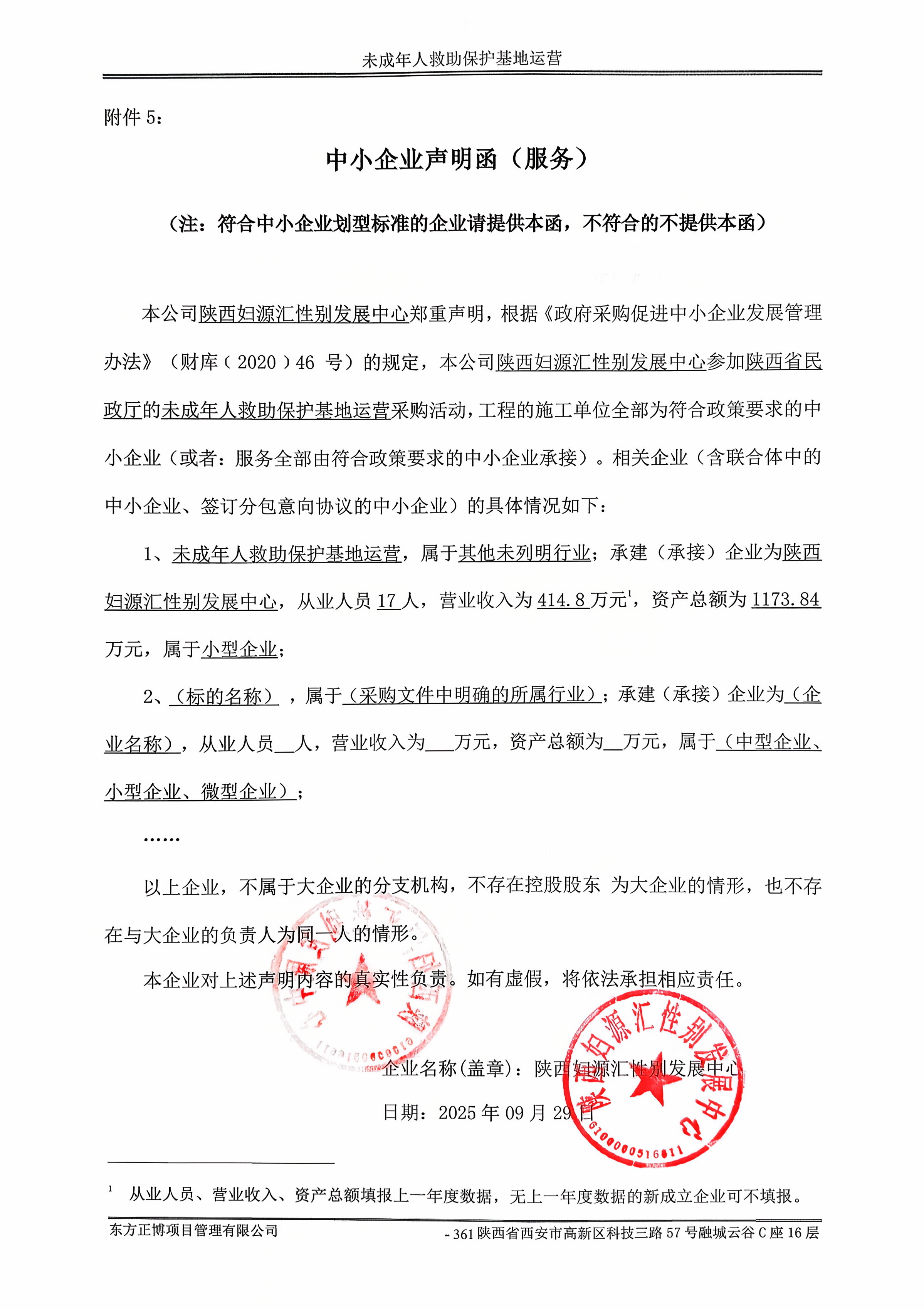 一、项目编号:ZCBN-省本级-2025-12399 二、项目名称:未成年人保护基地运营 三、采购结果 采购包1: 供应商名称 | 供应商地址 | 中标(成交)金额 | 评审总得分 | 陕西妇源汇性别发展中心 | 西安市和平路93号世纪广场杏园公寓5D | 148,000.00元 | 86.00 | 四、主要标的信息 合同包1(未成年人救助保护基地运营): 服务类(陕西妇源汇性别发展中心) 品目号 | 品目名称 | 采购标的 | 服务范围 | 服务要求 | 服务时间 | 服务标准 | 金额(元) | 1 | 社会与管理咨询服务 | 150000 | 详见磋商文件 | 详见磋商文件 | 合同签订后,自2025年11月15日开始服务期一年。 | 响应竞争性磋商文件要求 | 148,000.00 | 五、评审专家(单一来源采购人员)名单: 六、代理服务收费标准及金额: 代理服务收费标准及金额 | 招标代理服务费参考国家计委颁布的《招标代理服务收费管理暂行办法》(计价格〔2002〕1980号)、发改办价格〔2003〕857号、发改价格〔2011〕534号及发改价格〔2015〕299号文件规定收取,由成交供应商在领取成交通知书之前向代理公司支付。银行户名:东方正博项目管理有限公司开户银行:长安银行股份有限公司营业部账 号:806010001421008726联系电话:13389269983/029-88765283 | 合同包号 | 合同包名称 | 代理服务费金额(万元) | 收取对象 | 1 | 未成年人救助保护基地运营 | 0.222 | 中标(成交)供应商 | 七、公告期限 自本公告发布之日起1个工作日。 八、其他补充事宜 九、凡对本次公告内容提出询问,请按以下方式联系。 1.采购人信息 名称:陕西省民政厅机关 地址:西安市新城区东新街403号 联系方式:祁老师 029-63917480 2.采购代理机构信息 名称:东方正博项目管理有限公司 地址:陕西省西安市科技三路57号融城云谷C座16层 联系方式:029-88765283 3.项目联系方式 项目联系人:王工、李工 电话:13389269983/029-88765283 东方正博项目管理有限公司 2025年09月30日 |
