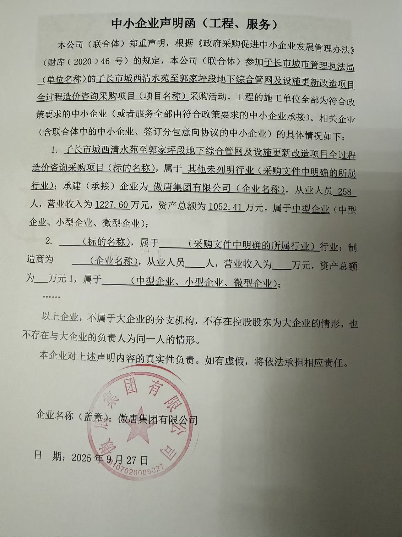 一、项目编号:ZXZC2025-024 二、项目名称:子长市城西清水苑至郭家坪段地下综合管网及设施更新改造项目全过程造价咨询采购项目 三、采购结果 采购包1: 供应商名称 | 供应商地址 | 中标(成交)金额 | 评审总得分 | 傲唐集团有限公司 | 陕西省汉中市汉台区竹园华府天玺中心办公楼1101室 | 810,000.00元 | 86.23 | 四、主要标的信息 合同包1(子长市城西清水苑至郭家坪段地下综合管网及设施更新改造项目全过程造价咨询采购项目): 服务类(傲唐集团有限公司) 品目号 | 品目名称 | 采购标的 | 服务范围 | 服务要求 | 服务时间 | 服务标准 | 金额(元) | 1 | 其他专业技术服务 | 子长市城西清水苑至郭家坪段地下综合管网及设施更新改造项目全过程造价咨询采购项目 | 详见采购文件 | 详见采购文件 | 合同签订之日起18个月 | 符合国家及行业相关标准 | 810,000.00 | 五、评审专家(单一来源采购人员)名单: 六、代理服务收费标准及金额: 代理服务收费标准及金额 | 参照《国家计委关于印发招标代理服务收费管理暂行办法的通知》(计价格【2002】1980号)和国家发改委办公厅颁发的《关于招标代理服务收费有关问题的通知》(发改办价格【2003】857号)收取。 | 合同包号 | 合同包名称 | 代理服务费金额(万元) | 收取对象 | 1 | 子长市城西清水苑至郭家坪段地下综合管网及设施更新改造项目全过程造价咨询采购项目 | 1.215 | 中标(成交)供应商 | 七、公告期限 自本公告发布之日起1个工作日。 八、其他补充事宜 九、凡对本次公告内容提出询问,请按以下方式联系。 1.采购人信息 名称:子长市城市管理执法局 地址:子长市暖水沟旧粮站 联系方式:15332567900 2.采购代理机构信息 名称:陕西泽信项目管理有限公司 地址:延安市新区能源小区B区7号楼一单元1301室 联系方式:0911-8892737 3.项目联系方式 项目联系人:赵勃勃 电话:0911-8892737 陕西泽信项目管理有限公司 2025年10月09日 |