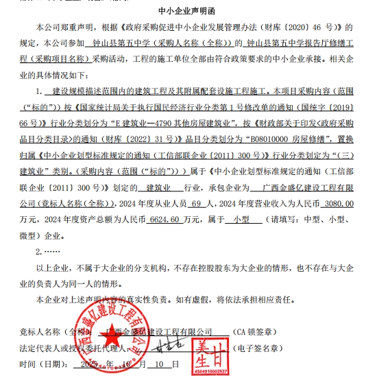 一、项目编号:HZZC2025-C2-220109-GXJY 二、项目名称:钟山县第五中学报告厅修缮工程 三、中标(成交)信息 1.中标结果: | 序号 | 中标(成交)金额(元) | 中标供应商名称 | 中标供应商地址 | | 1 | 报价:1089440.83(元) | 广西金盛亿建设工程有限公司 | 钟山县钟山镇北环东路一巷(城东社区居委斜对面) |