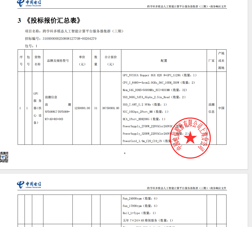 一、项目编号:310000000250808127708-00264279 二、项目名称:跨学科多模态人工智能计算平台服务器集群(三期) 三、中标(成交)信息 | 序号 | 标项名称 | 中标供应商名称 | 中标供应商地址 | 评审总得分 | 中标(成交金额) | 备注 | | 1 | 跨学科多模态人工智能计算平台服务器集群(三期) | 中国电信股份有限公司上海分公司 | 上海上海市其它区世纪大道211号 | 98.54 | 39297500.00元 | 无 | 四、主要标的信息 | 序号 | 包名称 | 标的名称 | 品牌 | 规格型号 | 数量 | 单价 | | 1 | 跨学科多模态人工智能计算平台服务器集群(三期) | 跨学科多模态人工智能计算平台服务器集群(三期) | 浪潮信息 | 浪潮NF5688G7(NF5688-M7-A0-R0-00)等 | 1 | 39297500.00 | 五、评审专家(单一来源采购人员)名单: 巴玉华,陈强,闻天明,张迎冬,张慧丰,吴俊,丁岳伟 六、代理服务收费标准及金额: 1.代理服务收费标准:无 2.代理服务收费金额(元):0.0 七、公告期限 自本公告发布之日起1个工作日。 八、其他补充事宜 推荐理由: 中国电信股份有限公司上海分公司提供技术参数证明材料齐全有效,技术方案针对性较强,人员配置较优、类似业绩丰富。经评审委员会评审推荐为第一中标候选人。中标(成交供应商)的评审总得分为:98.54 九、凡对本次公告内容提出询问,请按以下方式联系 1.采购人信息 名 称:上海科技大学 地 址:华夏中路393号 联系方式:021-20680910 2.采购代理机构信息 名 称:上海市政府采购中心 地 址:上海市大连路515号 联系方式:35968037 3.项目联系方式 项目联系人:王通 电 话:35968037 附件信息: |