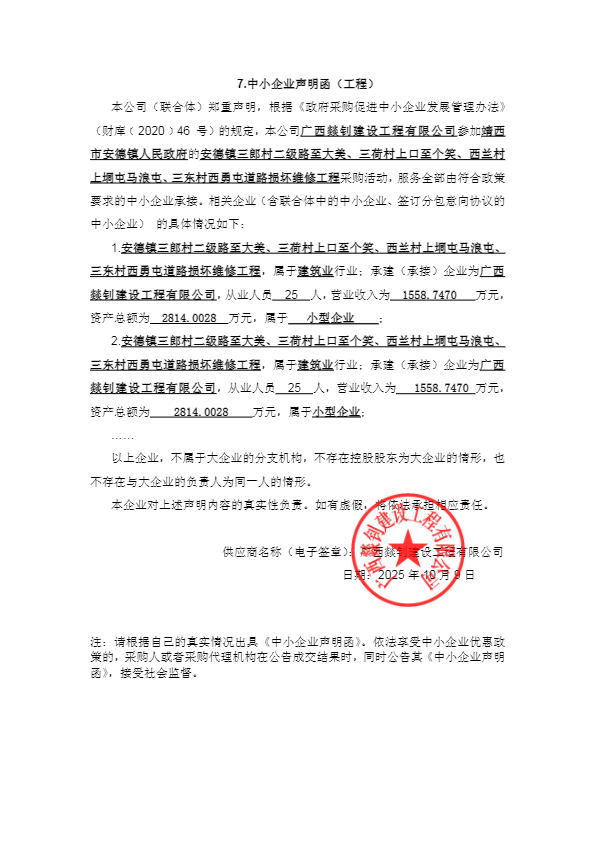 公告概要:公告信息: | 采购项目名称 | 安德镇三郎村二级路至大美、三荷村上口至个笑、西兰村上垌屯马浪屯、三东村西勇屯道路损坏维修工程 | 品目 | | 采购单位 | 靖西市安德镇人民政府 | 行政区域 | 广西壮族自治区 | 公告时间 | 2025年10月11日 15:22 | 评审专家(单一来源采购人员)名单 | 方恩光,杨程棋(第1分标采购人代表),姚茂芯 | 总成交金额 | ¥189.990000 万元(人民币) | 联系人及联系方式: | 项目联系人 | 班艺芹 | 项目联系电话 | 0776-2988148 | 采购单位 | 靖西市安德镇人民政府 | 采购单位地址 | 靖西市安德镇安德街99号 | 采购单位联系方式 | 0776-6460005 | 代理机构名称 | 广西灿达工程咨询有限公司 | 代理机构地址 | 广西百色市右江区前程路4号长乐星城第1幢13层1302号 | 代理机构联系方式 | 0776-2988148 |