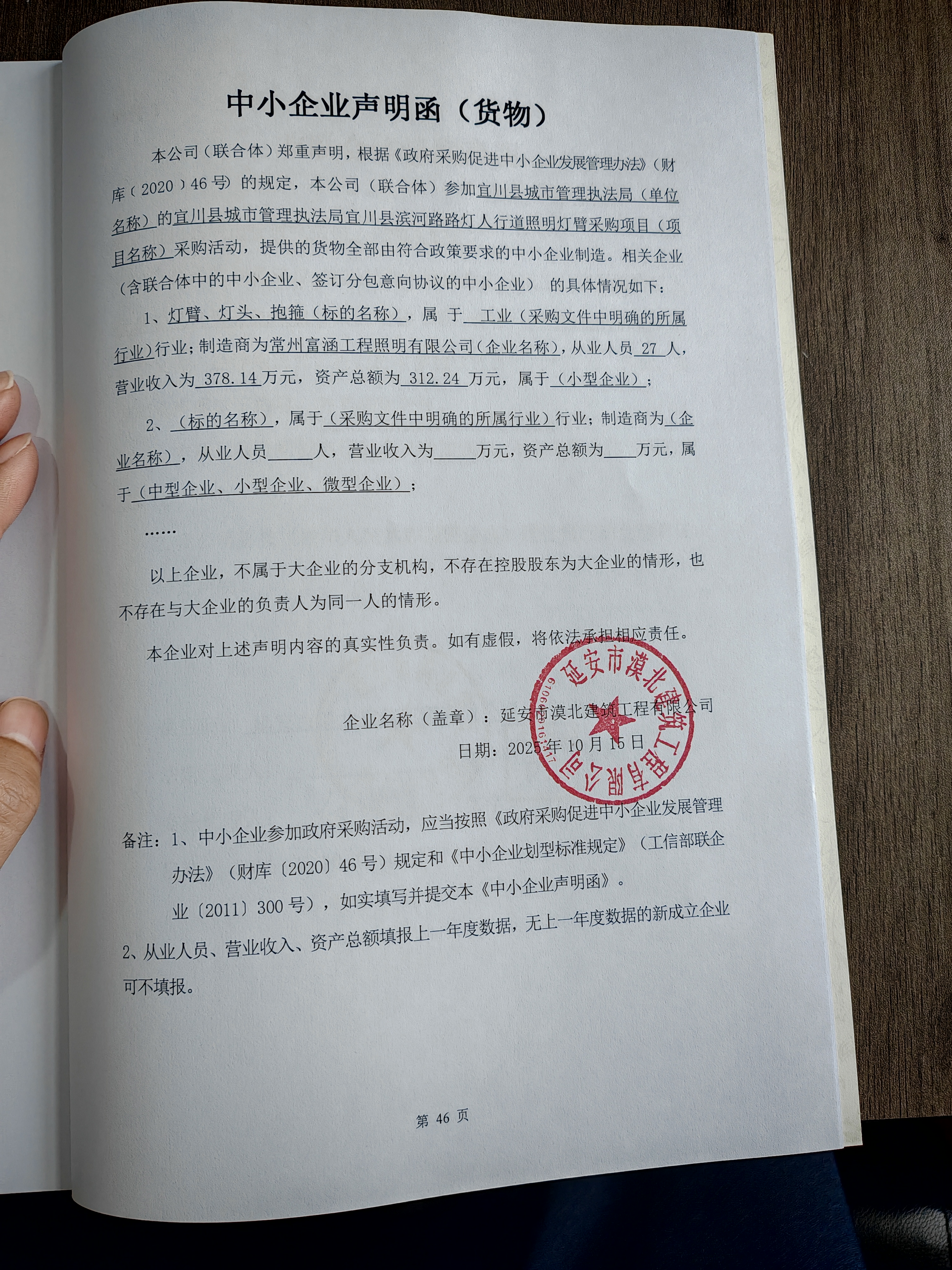 公告概要:公告信息: | 采购项目名称 | 宜川县滨河路路灯人行道照明灯臂采购项目 | 品目 | | 采购单位 | 宜川县城市管理执法局 | 行政区域 | 宜川县 | 公告时间 | 2025年10月15日 11:39 | 评审专家(单一来源采购人员)名单 | 李学军,窦延峰,杨引霞 | 总成交金额 | ¥29.500000 万元(人民币) | 联系人及联系方式: | 项目联系人 | 谢帅 | 项目联系电话 | 13992113344 | 采购单位 | 宜川县城市管理执法局 | 采购单位地址 | 宜川县党湾街26号 | 采购单位联系方式 | 19212921292 | 代理机构名称 | 陕西悦荣项目管理有限公司 | 代理机构地址 | 延安市新区鲁艺三号苑24号楼1单元1101 | 代理机构联系方式 | 13992113344 | 附件: | 附件1 | 宜川县城市管理执法局宜川县滨河路路灯人行道照明灯臂采购项目中标(成交)明细.pdf | 附件2 | 谈判文件.docx | 附件3 | 中小企业声明函.jpg |