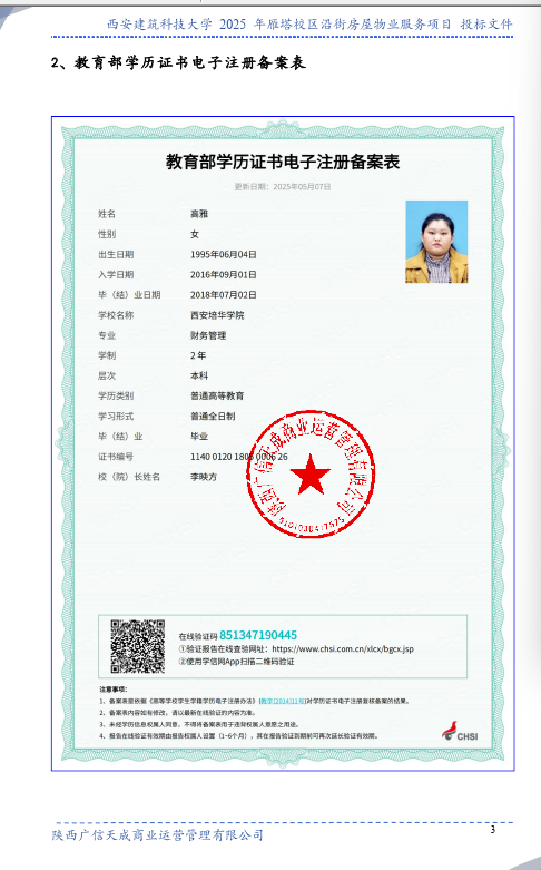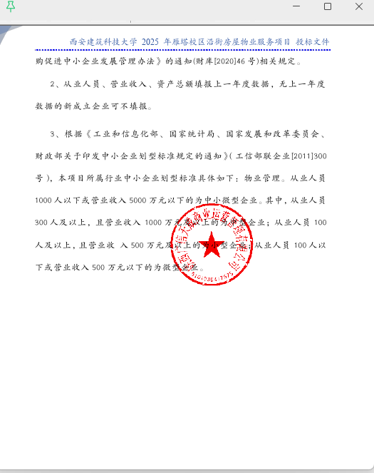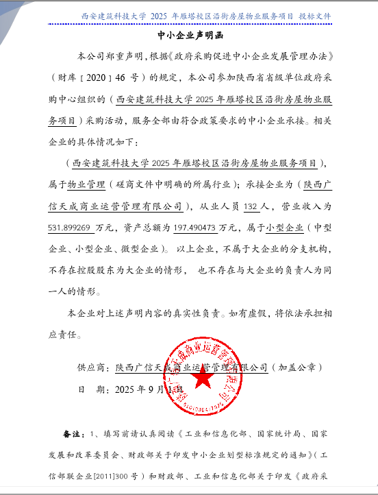 七、公告期限自本公告发布之日起1个工作日。 八、其他补充事宜根据财办库〔2023〕243号《关于进一步提高政府采购透明度和采购效率相关事项的通知》公示如下:陕西广信天成商业运营管理有限公司评审总得分:192.00分;评审平均分:64.00分;最终得分:91.13分。 九、凡对本次公告内容提出询问,请按以下方式联系。1.采购人信息名称:西安建筑科技大学 地址:西安市雁塔路中段13号 联系方式:029-82201427 2.采购代理机构信息名称:陕西省省级单位政府采购中心 地址:西安市碑林区长安北路14号 联系方式:029-88661306 3.项目联系方式项目联系人:李老师 电话:029-88661306 陕西省省级单位政府采购中心 2025年10月15日 相关公告 |