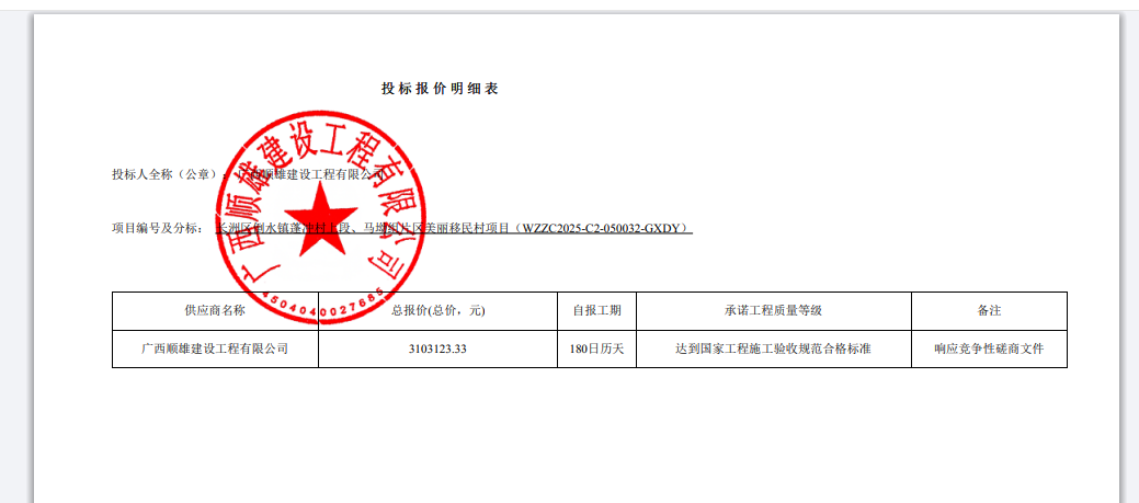 一、项目编号:WZZC2025-C2-050032-GXDY 二、项目名称:长洲区倒水镇蓬冲村上段、马坳组片区美丽移民村项目 三、中标(成交)信息 1.中标结果: 序号 | 中标(成交)金额(元) | 中标供应商名称 | 中标供应商地址 | 1 | 总报价:3103123.33(元) | 广西顺雄建设工程有限公司 | 梧州市湖滨路66号八层1号公寓式办公 |