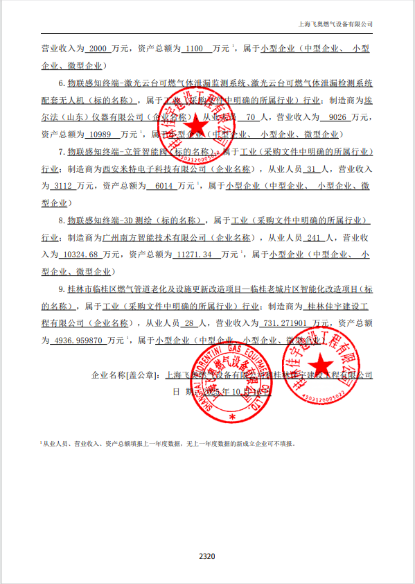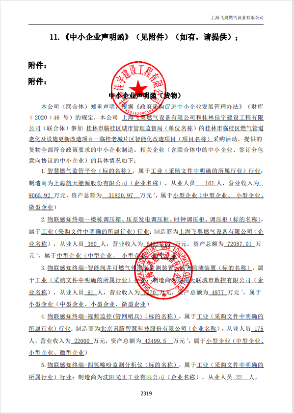 2.废标结果: 四、主要标的信息 货物类主要标的信息: 序号 | 标项名称 | 标的名称 | 品牌 | 规格型号 | 数量 | 单价(元) | 1 | 桂林市临桂区燃气管道老化及设施更新改造项目—临桂老城片区智能化改造项目 | 综合展示系统 | 航天能源 | 无规格型号 | 1 | 0 | 2 | 桂林市临桂区燃气管道老化及设施更新改造项目—临桂老城片区智能化改造项目 | 物联网管理系统 | 航天能源 | 无规格型号 | 1 | 0 | 3 | 桂林市临桂区燃气管道老化及设施更新改造项目—临桂老城片区智能化改造项目 | 监测与控制管理 | 航天能源 | 无规格型号 | 1 | 0 | 4 | 桂林市临桂区燃气管道老化及设施更新改造项目—临桂老城片区智能化改造项目 | 报警和预警管理 | 航天能源 | 无规格型号 | 1 | 0 | 5 | 桂林市临桂区燃气管道老化及设施更新改造项目—临桂老城片区智能化改造项目 | 设备设施管理 | 航天能源 | 无规格型号 | 1 | 0 | 6 | 桂林市临桂区燃气管道老化及设施更新改造项目—临桂老城片区智能化改造项目 | 系统管理与日志审计系统 | 航天能源 | 无规格型号 | 1 | 0 | 7 | 桂林市临桂区燃气管道老化及设施更新改造项目—临桂老城片区智能化改造项目 | 平台网络架构 | 航天能源 | 无规格型号 | 1 | 0 | 8 | 桂林市临桂区燃气管道老化及设施更新改造项目—临桂老城片区智能化改造项目 | 平台部署 | 航天能源 | 无规格型号 | 1 | 0 | 9 | 桂林市临桂区燃气管道老化及设施更新改造项目—临桂老城片区智能化改造项目 | 系统性能指标 | 航天能源 | 无规格型号 | 1 | 0 | 10 | 桂林市临桂区燃气管道老化及设施更新改造项目—临桂老城片区智能化改造项目 | 楼栋调压箱 | 上海飞奥 | 调压箱额定流量25方54套、50方62套、75方48套、100方45套、150方19套 | 228 | 27800 | 11 | 桂林市临桂区燃气管道老化及设施更新改造项目—临桂老城片区智能化改造项目 | 压差发电调压柜 | 上海飞奥 | 调压柜额定流量700方1套 | 1 | 209610 | 12 | 桂林市临桂区燃气管道老化及设施更新改造项目—临桂老城片区智能化改造项目 | 时钟调压柜 | 上海飞奥 | 调压柜额定流量600方2套、700方3套 | 5 | 198000 | 13 | 桂林市临桂区燃气管道老化及设施更新改造项目—临桂老城片区智能化改造项目 | 调压柜 | 上海飞奥 | 调压柜额定流量100方1套、200方19套、300方14套、400方12套、500方13套、600方1套 | 60 | 188700 | 14 | 桂林市临桂区燃气管道老化及设施更新改造项目—临桂老城片区智能化改造项目 | 智能阀井可燃气体泄漏监测装置 | 湖南天联 | TLJJ001 | 136 | 9890 | 15 | 桂林市临桂区燃气管道老化及设施更新改造项目—临桂老城片区智能化改造项目 | 视频监控(管网哨兵) | 北京讯腾 | Cnten-100 | 200 | 6840 | 16 | 桂林市临桂区燃气管道老化及设施更新改造项目—临桂老城片区智能化改造项目 | 压力监测装置 | 湖南天联 | TLYLO02 | 175 | 8430 | 17 | 桂林市临桂区燃气管道老化及设施更新改造项目—临桂老城片区智能化改造项目 | 四氢噻吩监测分析仪 | 沈阳光正 | JCY-D-Z-THT 11VDC | 10 | 54500 | 18 | 桂林市临桂区燃气管道老化及设施更新改造项目—临桂老城片区智能化改造项目 | 激光云台可燃气体泄漏检测系统 | 埃尔法 | P20 12VDC | 98 | 129400 | 19 | 桂林市临桂区燃气管道老化及设施更新改造项目—临桂老城片区智能化改造项目 | 立管智能阀 | 西安米特 | SVC-CG-DN50、SVC-CG-DN40、SVC-CG-DN32 | 100 | 2980 | 20 | 桂林市临桂区燃气管道老化及设施更新改造项目—临桂老城片区智能化改造项目 | 3D测绘 | 南方智能 | 无规格型号 | 1 | 95400 | 21 | 桂林市临桂区燃气管道老化及设施更新改造项目—临桂老城片区智能化改造项目 | 激光云台可燃气体泄漏检测系统配套无人机 | 埃尔法 | 无规格型号 | 2 | 129000 | 五、评审专家(单一来源采购人员)名单: 李长俊,阳文芳(第1分标采购人代表),葛壮(第1分标采购人代表),黄淑贞,李靖,欧新乾,蒙奕冰 六、代理服务收费标准及金额: 1.代理服务收费标准:本项目服务费按照差额定律累进计费方式计算,标准如下: 2.代理服务收费金额(元):233629.00 七、公告期限 自本公告发布之日起1个工作日。 八、其他补充事宜 1、未中标情况: 标项一:供应商名称 得分 名次 上海飞奥燃气设备有限公司、桂林佳宇建设工程有限公司(联合体)84.57 排名第1 佛山市华亮本生燃气设备有限公司 61.85 排名第2 博思特能源装备(天津)股份有限公司 55.99 排名第 3 上海纯皓能源设备有限公司 48.56 排名第 4 2、未通过资格性审查和符合性审查的投标人情况:河北瑞星燃气设备股份有限公司、豪斯成都鑫电子探测技术有限公司(联合体)与投标文件内联合体协议单 位不一致(河北瑞星燃气设备股份有限公司、中泓河北工程技术有限公司) ,资格审查不通过。 3、信息公告发布媒体:http://www.ccgp.gov.cn(中国政府采购网)、http://zfcg.gxzf.gov.cn(广西壮族自治区政府采购网)、http://zfcg.czj.guilin.gov.cn(桂林市政府采购网)。 4、供应商认为成交结果使自己的权益受到损害的,可以自成交结果公告期限届满之日起七个工作日内以书面形式向采购代理机构提出质疑,逾期将不再受理。 九、对本次公告内容提出询问,请按以下方式联系 1.采购人信息 名 称:桂林市临桂区城市管理监督局 地 址:桂林市临桂区金水路 联系方式:0773-8101660 2.采购代理机构信息 名 称:广西中承建设工程咨询有限公司 地 址:桂林市临桂区临桂镇
