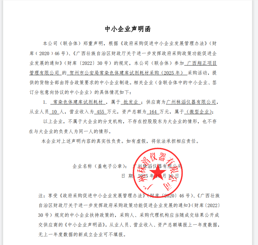 一、项目编号:HZZC2025-J1-990231-GXXZ 二、项目名称:贺州市公安局常染色体建库试剂耗材采购(2025年) 三、中标(成交)信息 1.中标结果: 序号 | 中标(成交)金额(元) | 中标供应商名称 | 中标供应商地址 | 1 | 报价:629000(元) | 广州秣滔仪器有限公司 | 广州市天河区沐陂西街18号大院A08房(仅限办公用途) |