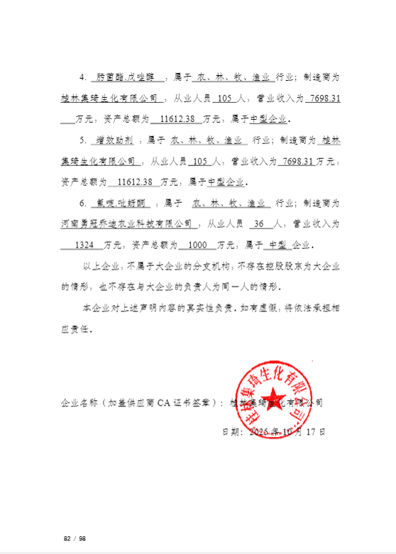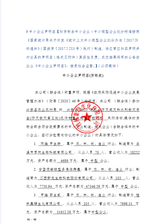 2.废标结果: 四、主要标的信息 货物类主要标的信息: 序号 | 标项名称 | 标的名称 | 品牌 | 规格型号 | 数量 | 单价(元) | 1 | 兴安县2025年农业防灾减灾和水利救灾资金(防灾救灾第三批)农作物重大病虫防控项目 | 阿维·甲虫肼 | 冠美秀 | 瓶 | 912 | 75 | 2 | 兴安县2025年农业防灾减灾和水利救灾资金(防灾救灾第三批)农作物重大病虫防控项目 | 甘蓝夜蛾核型多角体病毒 | 新龙惠稻欢 | 瓶 | 125 | 300 | 3 | 兴安县2025年农业防灾减灾和水利救灾资金(防灾救灾第三批)农作物重大病虫防控项目 | 肟菌酯.戊唑醇 | 籽炫 | 瓶(袋) | 1104 | 80 | 4 | 兴安县2025年农业防灾减灾和水利救灾资金(防灾救灾第三批)农作物重大病虫防控项目 | 增效助剂 | 施倍丰/奇功 | 瓶 | 2480 | 18 | 5 | 兴安县2025年农业防灾减灾和水利救灾资金(防灾救灾第三批)农作物重大病虫防控项目 | 氟啶.吡蚜酮 | 舞玡蓟 | 瓶 | 1100 | 110 | 6 | 兴安县2025年农业防灾减灾和水利救灾资金(防灾救灾第三批)农作物重大病虫防控项目 | 甲维.茚虫威 | 阿凯 | 瓶 | 740 | 135 | 五、评审专家(单一来源采购人员)名单: 蒙娟娟,蒋德赏,李玉春 六、代理服务收费标准及金额: 1.代理服务收费标准:本项目代理服务费参照计价格[2002]1980号《招标代理服务收费管理暂行办法》货物类收费标准(不足8000元的,按8000元收取。) 2.代理服务收费金额(元):8000 七、公告期限 自本公告发布之日起1个工作日。 八、其他补充事宜 1、未通过资格及符合性审查情况:无 2、成交供应商的排名:桂林集琦生化有限公司 排名1。 3、未成交供应商的排名: 广西创态有害生物防治有限公司,排名2; 桂林乐耕农业发展有限公司,排名3; 4、信息发布媒体:http://www.ccgp.gov.cn(中国政府采购网)、http://zfcg.gxzf.gov.cn/(广西政府采购网)、http://gl.zfcg.zcygov.cn/(桂林市政府采购网)。 5、供应商认为成交果使自己的权益受到损害的,可以在成交公告期限届满之日起七个工作日内以书面形式向广西立诚工程项目管理咨询有限公司提出质疑,逾期将不再受理。 九、对本次公告内容提出询问,请按以下方式联系 1.采购人信息 名 称:兴安县农业农村局 地 址:兴安县教育路39号 联系方式:0773-6222165 2.采购代理机构信息 名 称:广西立诚工程项目管理咨询有限公司 地 址:桂林市叠彩区站前路恒大广场28栋23-23、23-24号办公 联系方式:0773-6783990 3.项目联系方式 项目联系人:王工 电 话:0773-6783990 附件信息: |