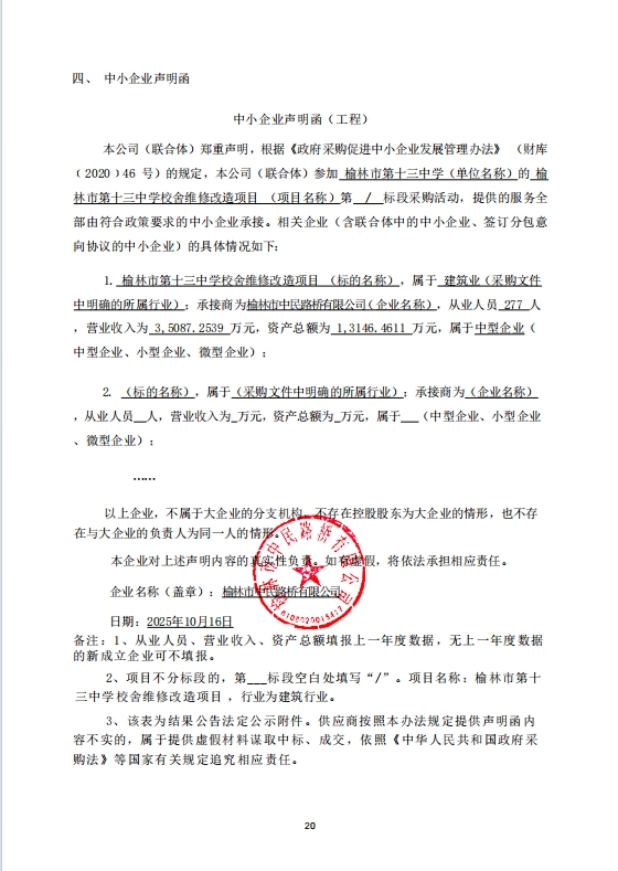 公告概要:公告信息: | 采购项目名称 | 第十三中学校舍维修改造项目 | 品目 | | 采购单位 | 榆林市第十三中学 | 行政区域 | 榆阳区 | 公告时间 | 2025年10月20日 17:00 | 评审专家(单一来源采购人员)名单 | 张月芳,王艳娥,张海军 | 总成交金额 | ¥121.431000 万元(人民币) | 联系人及联系方式: | 项目联系人 | 榆林市榆阳区政府采购中心 | 项目联系电话 | 18629388603 | 采购单位 | 榆林市第十三中学 | 采购单位地址 | 榆林市榆阳区上郡南路太白路3号 | 采购单位联系方式 | 13571264456 | 代理机构名称 | 榆林市榆阳区政府采购中心 | 代理机构地址 | 榆林市榆阳区政务服务中心325室 | 代理机构联系方式 | 18629388603 | 附件: | 附件1 | 中小企业声明函.png | 附件2 | 榆林市第十三中学第十三中学校舍维修改造项目中标(成交)明细.pdf |