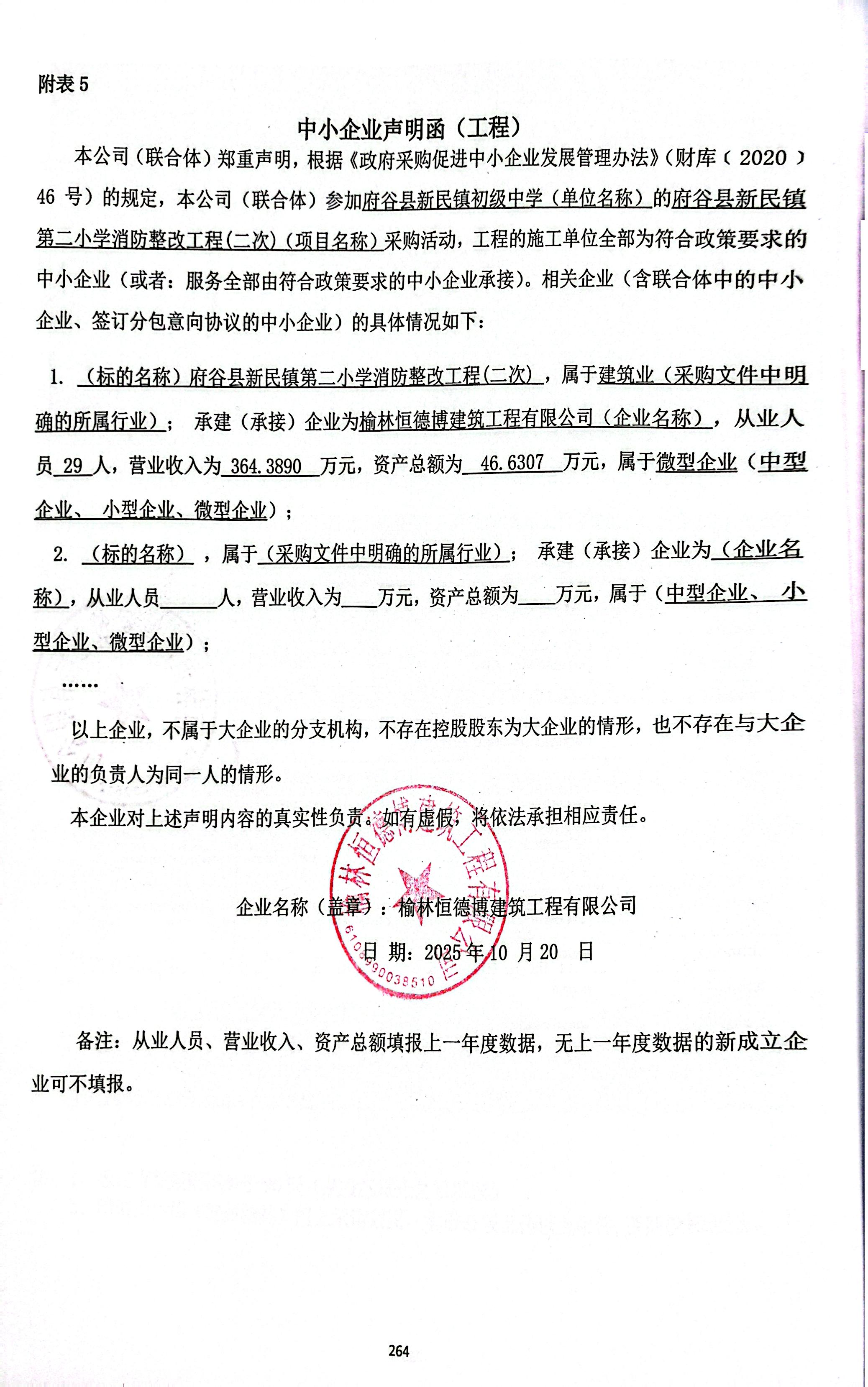 四、主要标的信息合同包1(府谷县新民镇第二小学消防整改工程(二次)): 工程类(榆林恒德博建筑工程有限公司)