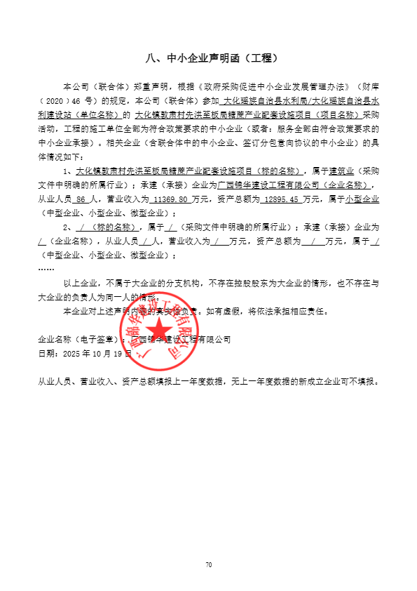 2.废标结果: 四、主要标的信息 工程类主要标的信息: 序号 | 标项名称 | 标的名称 | 施工范围 | 施工工期 | 项目经理 | 执业证书信息 | 1 | 大化镇敦肃村先洪至板局糖蔗产业配套设施项目 | 大化镇敦肃村先洪至板局糖蔗产业配套设施项目 | 大化镇敦肃村先洪至板局糖蔗产业配套设施项目项目,具体详见工程量清单或控制价及设计图纸 | 60日历天 | 唐政辉 | 桂245080907519 | 五、评审专家(单一来源采购人员)名单: 黄颖忠,韦惠庆,玉现才 六、代理服务收费标准及金额: 1.代理服务收费标准:以成交金额为计费额,按工程类采用差额定率累进法计算出收费基准价格,采购代理收费以收费基准价格收取。 2.代理服务收费金额(元):15796.2 七、公告期限 自本公告发布之日起1个工作日。 八、其他补充事宜 1.成交供应商评审总得分:81.67分。 2.公告媒体:广西壮族自治区政府采购网(http://zfcg.gxzf.gov.cn)、中国政府采购网(www.ccgp.gov.cn)、全国公共资源交易平台(广西.河池)(http://ggzy.jgswj.gxzf.gov.cn/hcggzy/)。 3.供应商认为成交结果使自己的权益受到损害的,可以在本成交结果公告发出之日起七个工作日内,按照《中华人民共和国财政部令第94号--政府采购质疑和投诉办法》以书面形式向代理机构广西新凯林管理咨询有限公司提出质疑,逾期将不再受理。 九、对本次公告内容提出询问,请按以下方式联系 1.采购人信息 名 称:大化瑶族自治县水利局 地 址:广西壮族自治区大化瑶族自治县大化镇北建丰北路东五巷1号 联系方式:0778-5817073 2.采购代理机构信息 名 称:广西新凯林管理咨询有限公司 地 址:河池市金城江区上任新城区澳北路162号2楼 联系方式:18778063395 3.项目联系方式 项目联系人:陆玉松 电 话:18778063395 附件信息: |