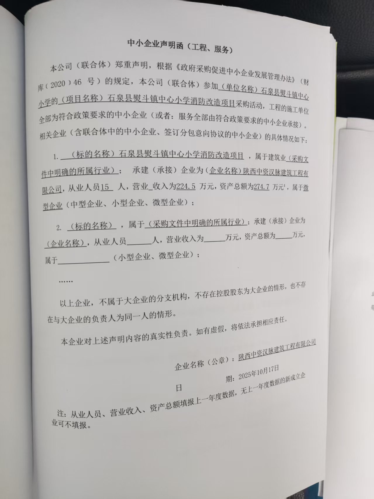 四、主要标的信息合同包1(石泉县熨斗镇中心小学消防改造项目): 工程类(陕西中资汉脉建筑工程有限公司)
