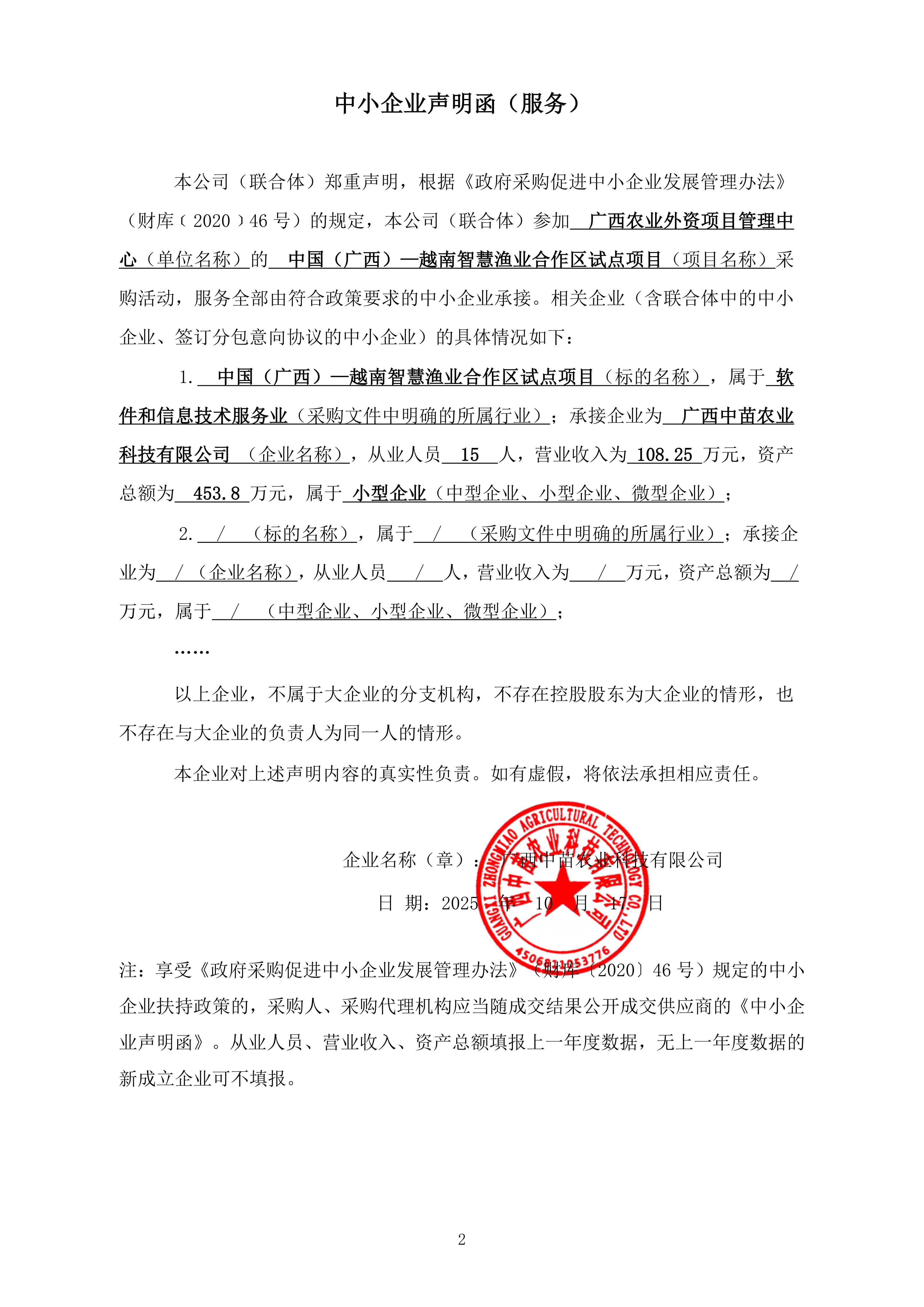 2.废标结果: 四、主要标的信息 服务类主要标的信息: | 序号 | 标项名称 | 标的名称 | 服务范围 | 服务要求 | 服务时间 | 服务标准 | | 1 | 中国(广西)—越南智慧渔业合作区试点项目 | 中国(广西)—越南智慧渔业合作区试点项目 | 详见采购文件 | 详见采购文件 | 详见采购文件 | 详见采购文件 |