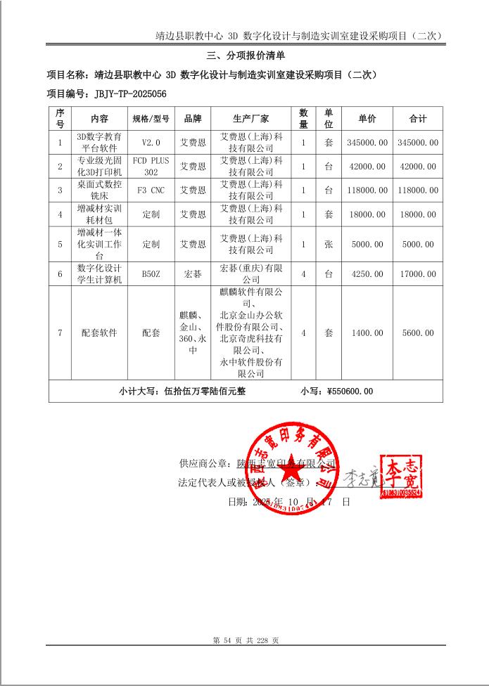 一、项目编号:JBJY-TP-2025056 二、项目名称:靖边县职教中心3D数字化设计与制造实训室建设采购项目(二次) 三、采购结果 采购包1: 供应商名称 | 供应商地址 | 中标(成交)金额 | 评审价格 | 陕西志宽印务有限公司 | 陕西省榆林市子洲县双镇二道街 | 548,000.00元 | 548,000.00元 | 四、主要标的信息 合同包1(靖边县职教中心3D数字化设计与制造实训室建设采购项目): 货物类(陕西志宽印务有限公司) 品目号 | 品目名称 | 采购标的 | 品牌 | 规格型号 | 数量(单位) | 单价(元) | 总价(元) | 1 | 其他信息化设备 | 3D数字化设计与制造实训室建设项目 | 艾费恩、宏基等 | V2.0、B50Z等 | 1.00(项) | 548,000.00 | 548,000.00 | 五、评审专家(单一来源采购人员)名单: 六、代理服务收费标准及金额: 代理服务收费标准及金额 | | 合同包号 | 合同包名称 | 代理服务费金额(万元) | 收取对象 | 1 | 靖边县职教中心3D数字化设计与制造实训室建设采购项目 | 0 | 无 | 七、公告期限 自本公告发布之日起1个工作日。 八、其他补充事宜 九、凡对本次公告内容提出询问,请按以下方式联系。 1.采购人信息 名称:靖边县职业教育中心 地址:靖边县长庆路北段 联系方式:13772366336 2.采购代理机构信息 名称:靖边县县级政府采购中心 地址:陕西省榆林市靖边县统万路120号 联系方式:0912-4636977转8002 3.项目联系方式 项目联系人:南海洋、李春雨 电话:13772366336、0912-4636977转8002 靖边县县级政府采购中心 2025年10月21日 |