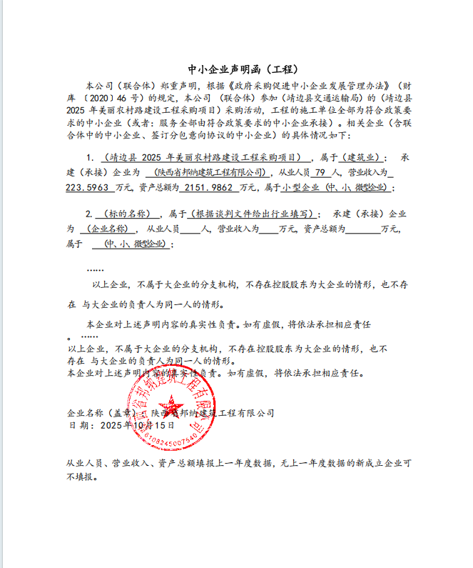 公告概要:公告信息: | 采购项目名称 | 靖边县2025年美丽农村路建设工程采购项目 | 品目 | | 采购单位 | 靖边县交通运输局 | 行政区域 | 靖边县 | 公告时间 | 2025年10月21日 15:23 | 评审专家(单一来源采购人员)名单 | 姬南旭,李丽,白秀琴 | 总成交金额 | ¥172.000000 万元(人民币) | 联系人及联系方式: | 项目联系人 | 姬南旭、李春雨 | 项目联系电话 | 15891235922、0912-4636977 转 8002 | 采购单位 | 靖边县交通运输局 | 采购单位地址 | 靖边县党政第二办公区2号楼26楼 | 采购单位联系方式 | 15891235922 | 代理机构名称 | 靖边县县级政府采购中心 | 代理机构地址 | 陕西省榆林市靖边县统万路120号 | 代理机构联系方式 | 0912-4636977 转 8002 | 附件: | 附件1 | 中小企业声明函.png | 附件2 | 分项报价表.pdf | 附件3 | 靖边县交通运输局靖边县2025年美丽农村路建设工程采购项目中标(成交)明细.pdf | 附件4 | 招标文件正文.pdf |