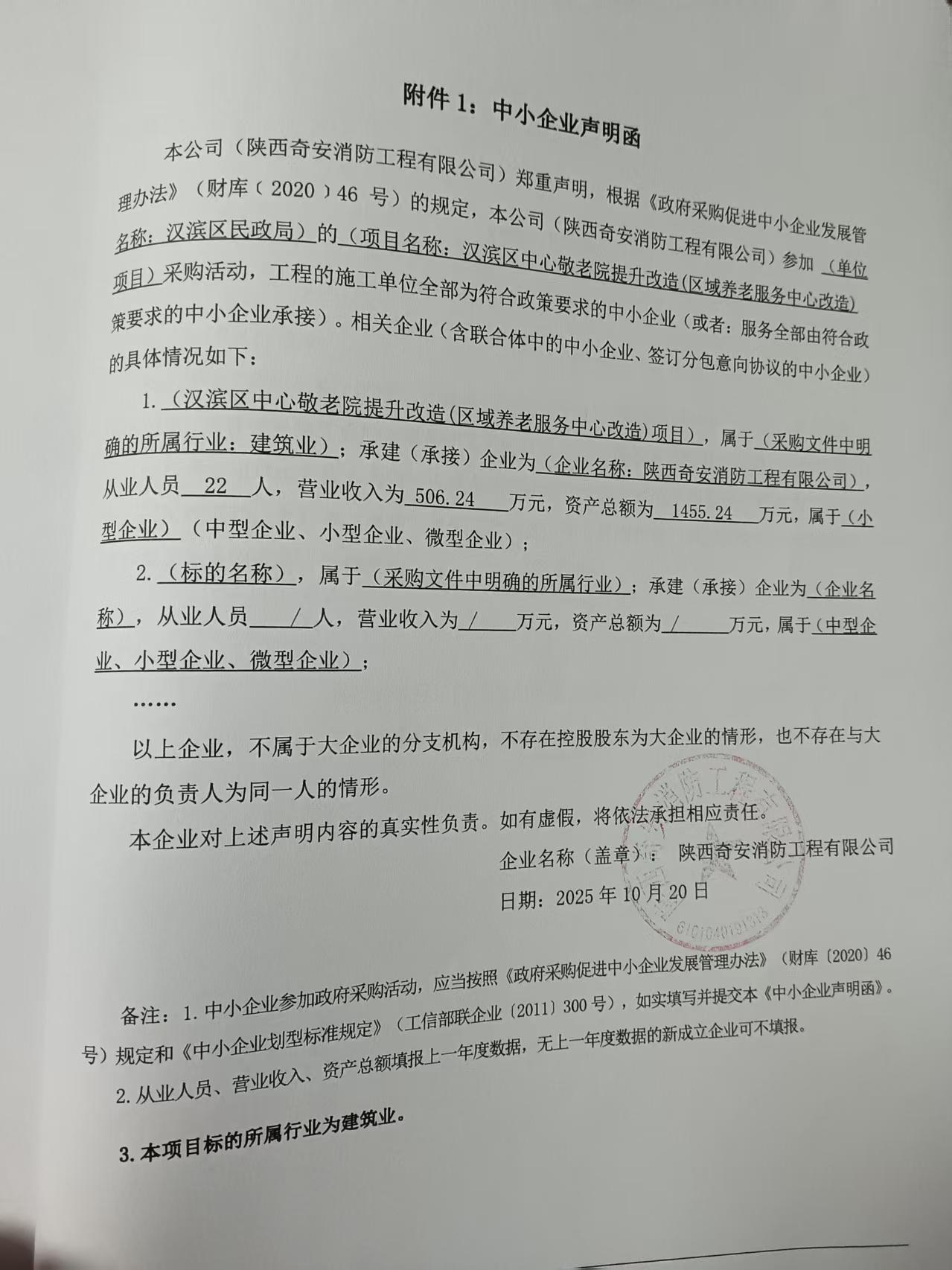 公告概要:公告信息: | 采购项目名称 | 汉滨区中心敬老院提升改造(区域养老服务中心改造)项目 | 品目 | | 采购单位 | 汉滨区民政局 | 行政区域 | 汉滨区 | 公告时间 | 2025年10月22日 09:12 | 评审专家(单一来源采购人员)名单 | 刘伟,许小安,王勇 | 总成交金额 | ¥46.500000 万元(人民币) | 联系人及联系方式: | 项目联系人 | 薛恒 | 项目联系电话 | 15991333905 | 采购单位 | 汉滨区民政局 | 采购单位地址 | 汉滨区陵园路33号 | 采购单位联系方式 | 0915-3239715 | 代理机构名称 | 陕西邦驰工程咨询有限公司 | 代理机构地址 | 安康市高新区缇香郡南门向东商铺1幢1单元 | 代理机构联系方式 | 15991333905 | 附件: | 附件1 | BC023-磋商文件.pdf | 附件2 | 汉滨区民政局汉滨区中心敬老院提升改造(区域养老服务中心改造)项目中标(成交)明细.pdf | 附件3 | 中小企业声明函.jpg |