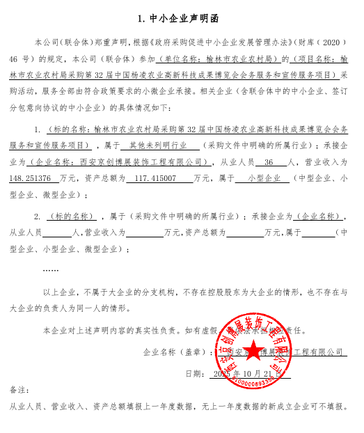公告概要:| 公告信息: | | 采购项目名称 | 采购第32届中国杨凌农业高新科技成果博览会会务服务和宣传服务项目 | | 品目 | | | 采购单位 | 榆林市农业农村局 | | 行政区域 | 榆林市 | 公告时间 | 2025年10月21日 17:34 | | 评审专家(单一来源采购人员)名单 | 贺玉芸,张芳,秦浪 | | 总成交金额 | ¥83.980000 万元(人民币) | | 联系人及联系方式: | | 项目联系人 | 张老师 | | 项目联系电话 | 17709120240 | | 采购单位 | 榆林市农业农村局 | | 采购单位地址 | 榆林市兴榆路榆林农业大厦 | | 采购单位联系方式 | 15229621456 | | 代理机构名称 | 陕西众信玖鼎项目管理有限责任公司 | | 代理机构地址 | 榆林市榆溪尚品3号楼1408 | | 代理机构联系方式 | 17709120240 | | 附件: | | 附件1 | 中小企业声明.png | | 附件2 | 榆林市农业农村局采购第32届中国杨凌农业高新科技成果博览会会务服务和宣传服务项目中标(成交)明细.pdf | | 附件3 | 磋商文件.pdf |