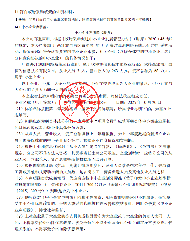 2.废标结果: 四、主要标的信息 服务类主要标的信息: 序号 | 标项名称 | 标的名称 | 服务范围 | 服务要求 | 服务时间 | 服务标准 | 1 | 广西海洋观测网络系统运行维护 | 广西海洋观测网络系统运行维护 | 自治区海洋局1套海洋观测数据系统迁移、1套视频会商系统维护、2套志愿船自动观测系统升级改造和1套广西海洋灾害综合防治系统展示等,详见采购文件 | 满足采购文件要求,验收达到合格标准 | 自合同签订之日起至2025年12月31日 | 符合本项目应执行的国家相关标准、行业标准、地方标准或者其他标准、规范。 |