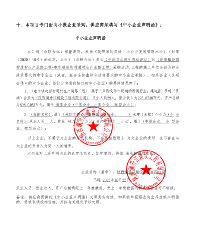 公告概要:公告信息: | 采购项目名称 | 电市镇赵峁村通村生产道路工程 | 品目 | | 采购单位 | 子洲县水保生态检测站 | 行政区域 | 子洲县 | 公告时间 | 2025年10月23日 08:59 | 评审专家(单一来源采购人员)名单 | 任必勇,樊波,李志忠 | 总成交金额 | ¥59.822300 万元(人民币) | 联系人及联系方式: | 项目联系人 | 雷浪 | 项目联系电话 | 19102921678 | 采购单位 | 子洲县水保生态检测站 | 采购单位地址 | 子洲县水务局办公大楼 | 采购单位联系方式 | 18791923555 | 代理机构名称 | 陕西天选建设项目管理有限公司 | 代理机构地址 | 航宇路众火创业基地3楼 | 代理机构联系方式 | 19102921678 | 附件: | 附件1 | 子洲县水保生态检测站电市镇赵峁村通村生产道路工程中标(成交)明细.pdf | 附件2 | 中小企业申明函.png | 附件3 | 招标文件正文.pdf |