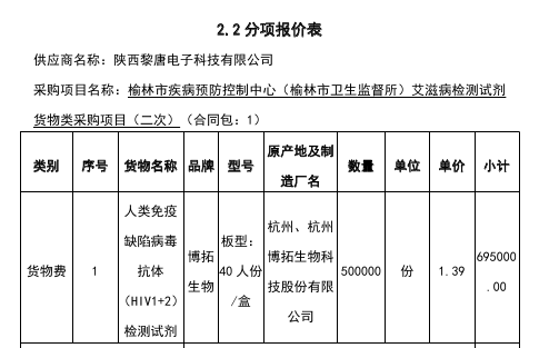 榆林市疾病预防控制中心艾滋病检测试剂耗材货物类采购项目(二次)中标(成交)结果公告