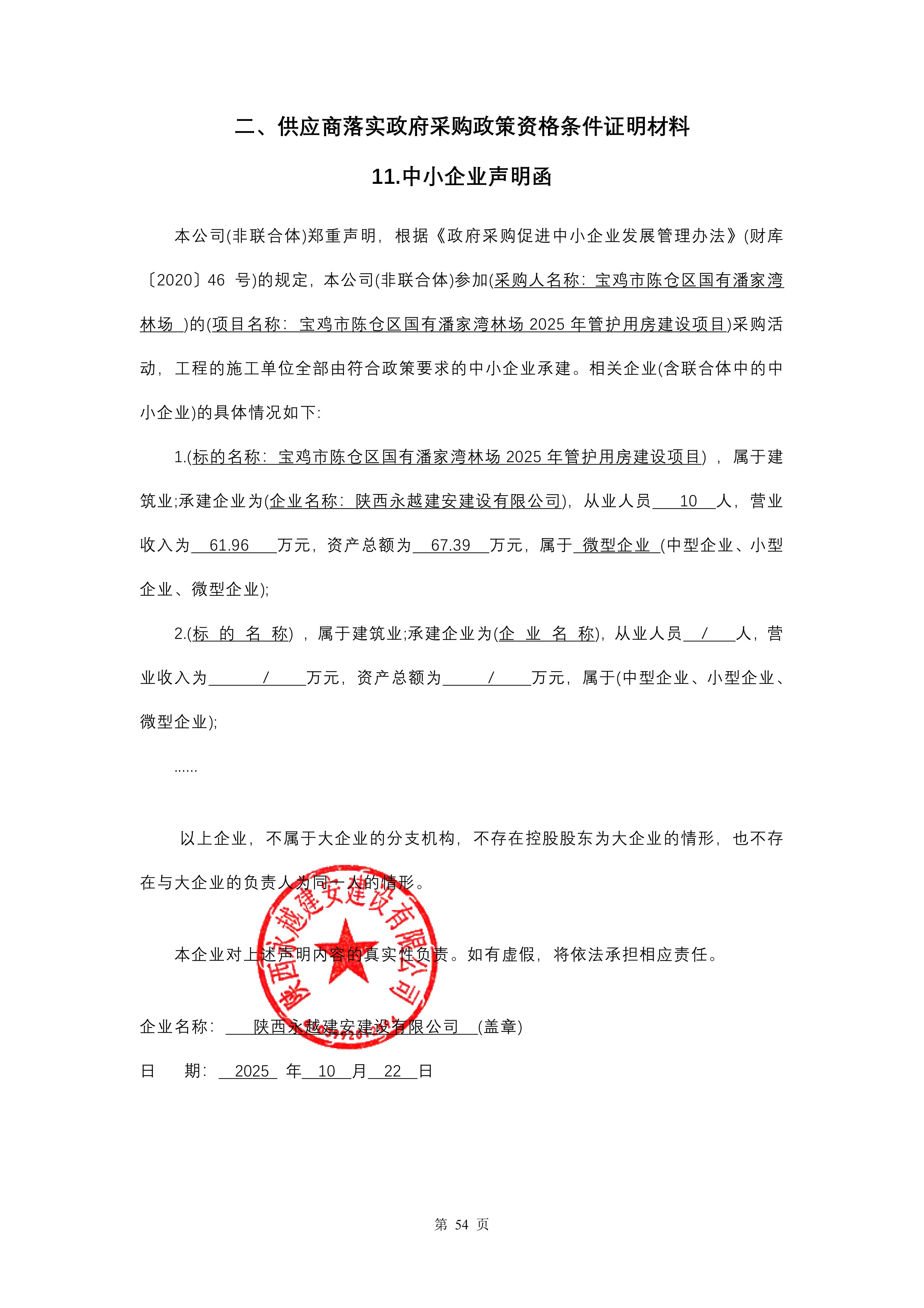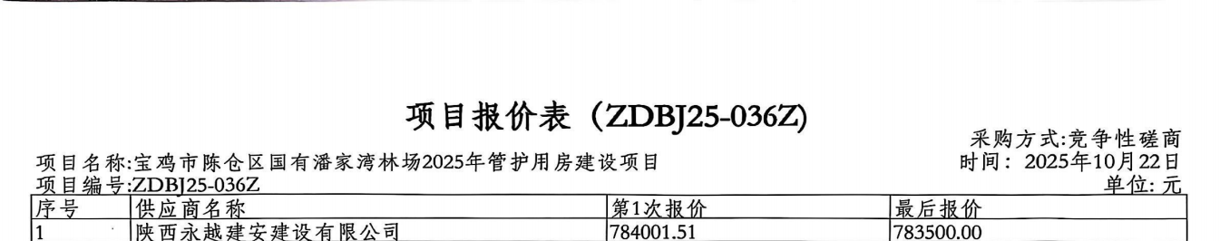 四、主要标的信息合同包1(宝鸡市陈仓区国有潘家湾林场2025年管护用房建设项目): 工程类(陕西永越建安建设有限公司)