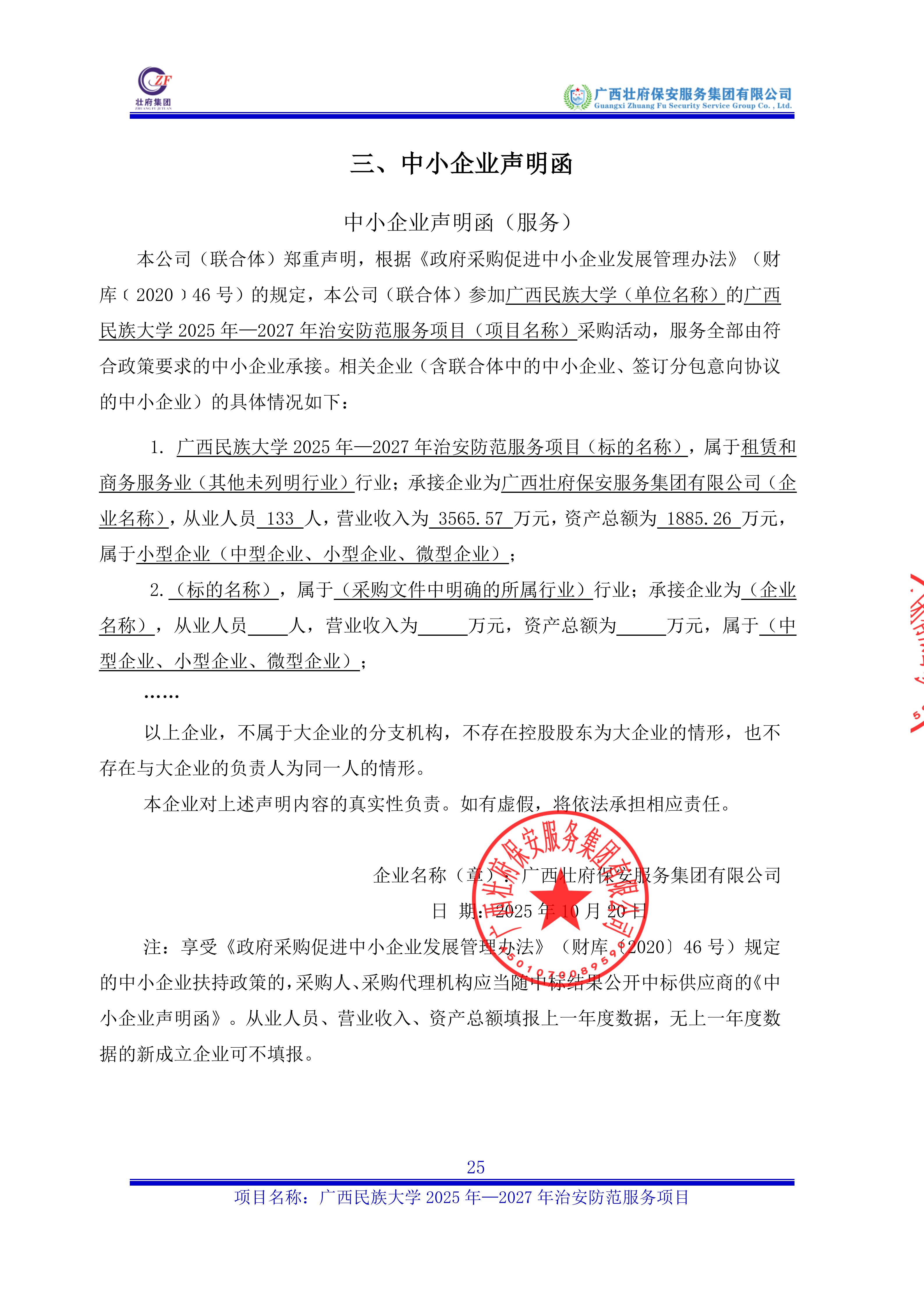 2.废标结果: 四、主要标的信息 服务类主要标的信息: 序号 | 标项名称 | 标的名称 | 服务范围 | 服务要求 | 服务时间 | 服务标准 | 1 | 广西民族大学2025年—2027年治安防范服务项目 | 广西民族大学2025年—2027年治安防范服务 | 广西民族大学相思湖校区(南宁市大学东路188号)、思源湖校区(南宁市大学西路158号)、武鸣校区(南宁市广西-东盟经济技术开发区发展大道1号)共3个校区的校园治安防范安保服务。具体内容详见招标文件“第二章采购需求”。 | 详见招标文件要求。 | 2年,共24个月,服务起止时间以合同具体签订时间为准。 | 符合招标文件要求。 |