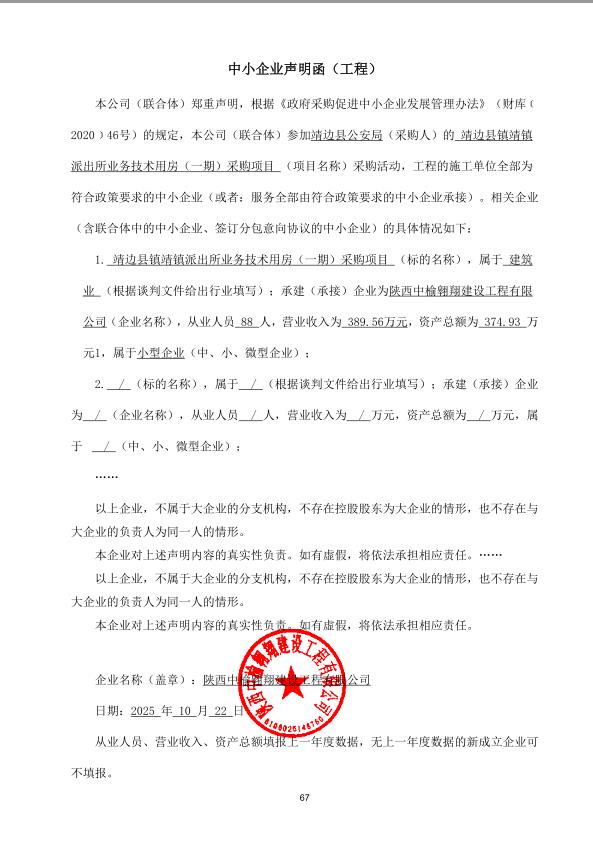 公告概要:| 公告信息: | | 采购项目名称 | 靖边县镇靖镇派出所业务技术用房(一期)采购项目 | | 品目 | | | 采购单位 | 靖边县公安局 | | 行政区域 | 靖边县 | 公告时间 | 2025年10月24日 08:43 | | 评审专家(单一来源采购人员)名单 | 温院东,张娟妮,赵慧 | | 总成交金额 | ¥356.939100 万元(人民币) | | 联系人及联系方式: | | 项目联系人 | 温院东、李春雨 | | 项目联系电话 | 18329205444 、0912-4636977 转 8002 | | 采购单位 | 靖边县公安局 | | 采购单位地址 | 靖边县公安局统万路 | | 采购单位联系方式 | 18329205444 | | 代理机构名称 | 靖边县县级政府采购中心 | | 代理机构地址 | 陕西省榆林市靖边县统万路120号 | | 代理机构联系方式 | 0912-4636977 转 8002 | | 附件: | | 附件1 | 竞争性谈判文件-066.pdf | | 附件2 | 分项报价表.zip | | 附件3 | 靖边县公安局靖边县镇靖镇派出所业务技术用房(一期)采购项目中标(成交)明细.pdf | | 附件4 | 中小企业声明函.jpg |
