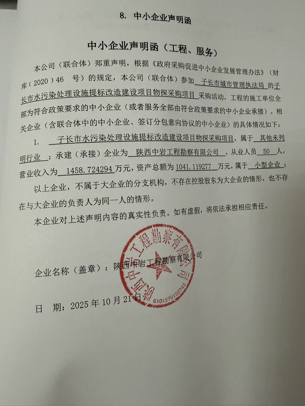 公告概要:| 公告信息: | | 采购项目名称 | 子长市水污染处理设施提标改造建设项目物探采购项目 | | 品目 | | | 采购单位 | 子长市城市管理执法局 | | 行政区域 | 子长县 | 公告时间 | 2025年10月23日 16:55 | | 评审专家(单一来源采购人员)名单 | 石占平,余浩,张玮 | | 总成交金额 | ¥52.450000 万元(人民币) | | 联系人及联系方式: | | 项目联系人 | 赵勃勃 | | 项目联系电话 | 0911-8892737 | | 采购单位 | 子长市城市管理执法局 | | 采购单位地址 | 子长市暖水沟旧粮站 | | 采购单位联系方式 | 15332567900 | | 代理机构名称 | 陕西泽信项目管理有限公司 | | 代理机构地址 | 延安市新区能源小区B区7号楼一单元1301室 | | 代理机构联系方式 | 0911-8892737 | | 附件: | | 附件1 | 子长市城市管理执法局子长市水污染处理设施提标改造建设项目物探采购项目中标(成交)明细.pdf | | 附件2 | 答疑文件正文[1].pdf | | 附件3 | 中小企业声明函.jpg |