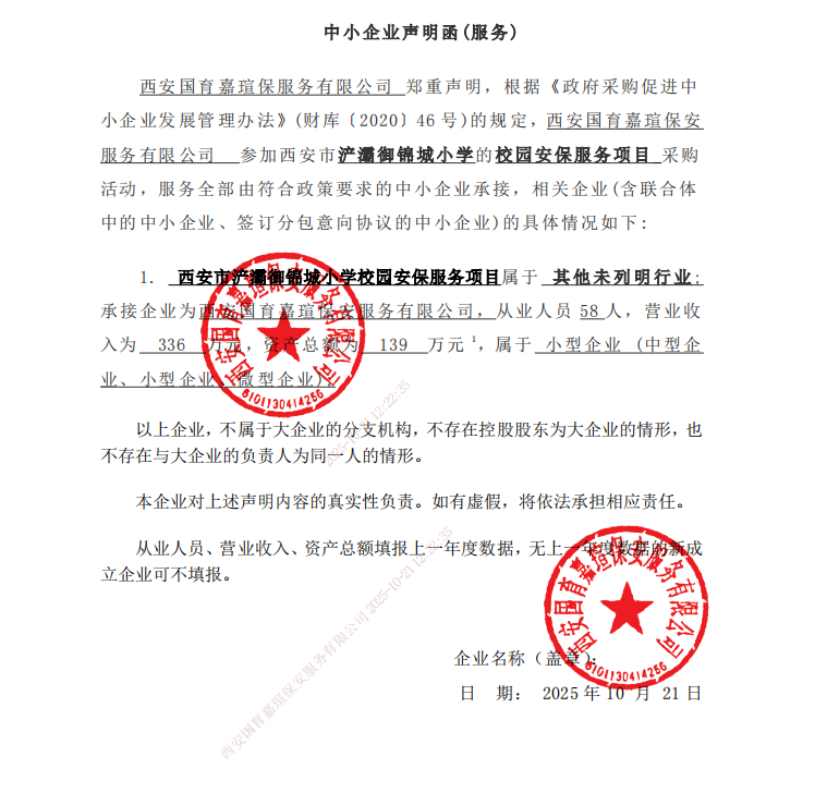 公告概要:| 公告信息: | | 采购项目名称 | 校园安保服务项目 | | 品目 | | | 采购单位 | 西安市浐灞御锦城小学 | | 行政区域 | 西安国际港务区管理委员会 | 公告时间 | 2025年10月23日 16:52 | | 评审专家(单一来源采购人员)名单 | 贺勇涛,阎磊,上官鸣 | | 总成交金额 | ¥99.540000 万元(人民币) | | 联系人及联系方式: | | 项目联系人 | 徐小宁 李敏 刘强 | | 项目联系电话 | 029-88228899-647 | | 采购单位 | 西安市浐灞御锦城小学 | | 采购单位地址 | 西安市浐灞生态区金融园区御城路1575号 | | 采购单位联系方式 | 029-83625008 | | 代理机构名称 | 龙寰项目管理咨询有限公司 | | 代理机构地址 | 陕西省西安市高新区太白南路181号A座A区501室 | | 代理机构联系方式 | 029-88228899-647 | | 附件: | | 附件1 | 校园安保服务项目报价明细附件.pdf | | 附件2 | 校园安保服务项目(LZBD2025-161120251009001)-文件集.zip | | 附件3 | 中小企业声明函.png |