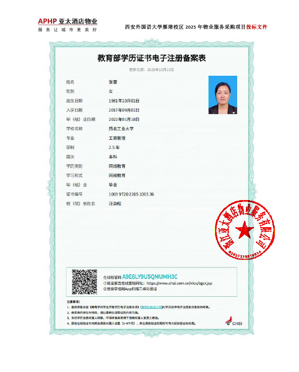 四、主要标的信息合同包1(西安外国语大学雁塔校区2025年物业服务采购项目): 服务类(浙江亚太酒店物业服务有限公司)