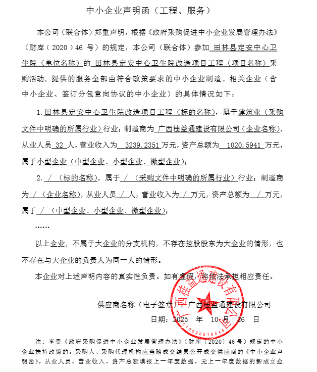 一、项目编号:BSZC2025-C2-290135-GXJC 二、项目名称:田林县定安中心卫生院改造项目工程 三、中标(成交)信息 1.中标结果: | 序号 | 中标(成交)金额(元) | 中标供应商名称 | 中标供应商地址 | | 1 | 报价:751010.96(元) | 广西桂益通建设有限公司 | 广西壮族自治区百色市田林县乐里镇河南片开发区(杨胜雄出租铺面) |
