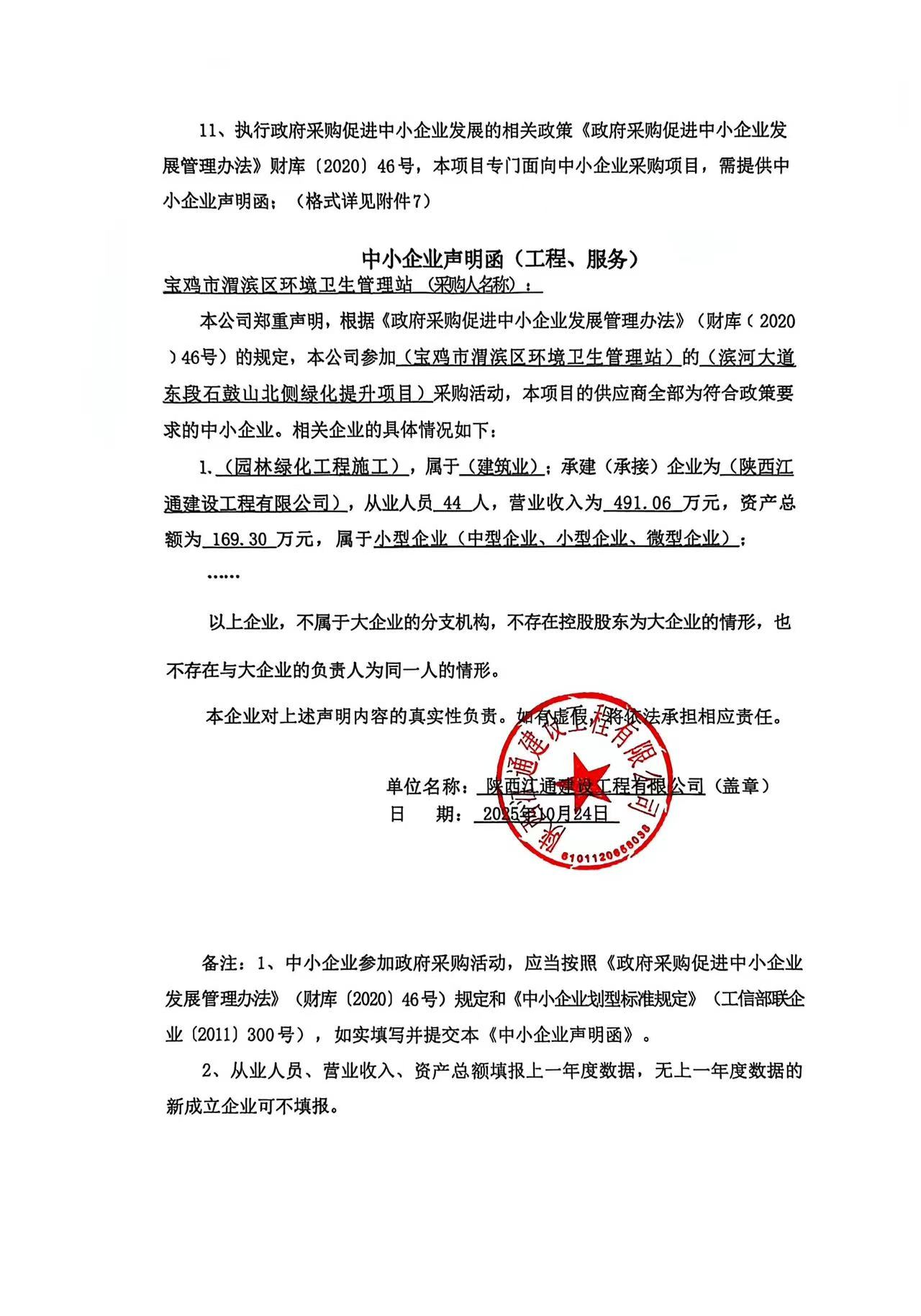 公告概要:| 公告信息: | | 采购项目名称 | 滨河大道东段石鼓山北侧绿化提升项目 | | 品目 | | | 采购单位 | 宝鸡市渭滨区环境卫生管理站 | | 行政区域 | 渭滨区 | 公告时间 | 2025年10月27日 14:50 | | 评审专家(单一来源采购人员)名单 | 刘城铭 ,刘虎霞,蔺苗苗 | | 总成交金额 | ¥43.783300 万元(人民币) | | 联系人及联系方式: | | 项目联系人 | 白阳阳 | | 项目联系电话 | 15129776212 | | 采购单位 | 宝鸡市渭滨区环境卫生管理站 | | 采购单位地址 | 渭滨区广元路11号 | | 采购单位联系方式 | 18729709682 | | 代理机构名称 | 陕西凯达项目管理有限公司 | | 代理机构地址 | 宝鸡市蟠龙路北段28号宝鸡国际中心5B804室 | | 代理机构联系方式 | 15129776212 | | 附件: | | 附件1 | 宝鸡市渭滨区环境卫生管理站滨河大道东段石鼓山北侧绿化提升项目中标(成交)明细.pdf | | 附件2 | 江通中小企业函.jpg |