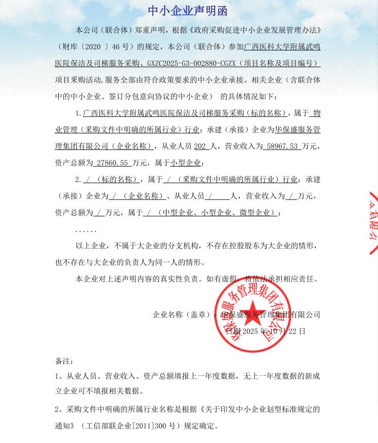 一、项目编号:GXZC2025-G3-002880-CGZX 二、项目名称:广西医科大学附属武鸣医院保洁及司梯服务采购 三、中标(成交)信息 1.中标结果: | 序号 | 中标(成交)金额(元) | 中标供应商名称 | 中标供应商地址 | | 1 | 报价:6550000.08(元) | 华保盛服务管理集团有限公司 | 中国(广西)自由贸易试验区南宁片区平乐大道15号五象绿地中心1号楼十一层1118 号办公“一照多址企业” |