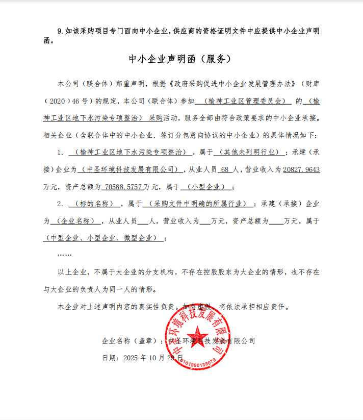 一、项目编号:SCZK2025-CS-2704-001二、项目名称:榆神工业区地下水污染专项整治三、采购结果  采购包1:    | 供应商名称 | 供应商地址 | 中标(成交)金额 | 评审总得分 |   | 中圣环境科技发展有限公司 | 陕西省西安市高新区锦业路2号旺都D座4单元26层 | 1,577,000.00元 | 82.00 |  四、主要标的信息 合同包1(榆神工业区地下水污染专项整治): 服务类(中圣环境科技发展有限公司)    | 品目号 | 品目名称 | 采购标的 | 服务范围 | 服务要求 | 服务时间 | 服务标准 | 金额(元) |   | 1 | 其他专业技术服务 | 榆神工业区地下水污染专项整治 | 榆神工业区地下水污染专项整治 | 满足采购人要求 | 2026年12月前完成 | 国家标准或行业标准 | 1,577,000.00 |  五、评审专家(单一来源采购人员)名单:六、代理服务收费标准及金额:    | 代理服务收费标准及金额 |  代理服务费参照《国家计委关于印发<招标代理服务收费管理暂行办法>的通知》(计价格[2002]1980号)规定标准收取。 |   | 合同包号 | 合同包名称 | 代理服务费金额(万元) | 收取对象 |   | 1 | 榆神工业区地下水污染专项整治 | 19616 | 采购人 |  七、公告期限自本公告发布之日起1个工作日。 八、其他补充事宜九、凡对本次公告内容提出询问,请按以下方式联系。 1.采购人信息名称:榆神工业区管理委员会 地址:陕西省榆林市榆神工业区清水工业园 联系方式:18609126181 2.采购代理机构信息名称:陕西省采购招标有限责任公司 地址:西安市高新区锦业路1号都市之门C座9层 联系方式:0912-3683703 3.项目联系方式 项目联系人:任小健、尚智 电话:15609123215、17349251183 陕西省采购招标有限责任公司 2025年10月30日 |