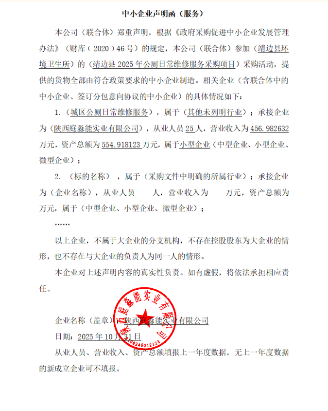 公告概要:| 公告信息: |  | 采购项目名称 | 靖边县2025年公厕日常维修服务采购项目 |  | 品目 |  |  | 采购单位 | 靖边县环境卫生所 |  | 行政区域 | 靖边县 | 公告时间 | 2025年11月03日  11:14 |  | 评审专家(单一来源采购人员)名单 | 张彦震,刘霄飞,薛燕 |  | 总成交金额 | ¥49.450000 万元(人民币) |  | 联系人及联系方式: |  | 项目联系人 | 李春雨 张彦震 |  | 项目联系电话 | 13892287285、0912-4636977 转 8002 |  | 采购单位 | 靖边县环境卫生所 |  | 采购单位地址 | 靖边县南环路转盘西南角 |  | 采购单位联系方式 | 13892287285 |  | 代理机构名称 | 靖边县县级政府采购中心 |  | 代理机构地址 | 陕西省榆林市靖边县统万路120号 |  | 代理机构联系方式 | 0912-4636977 转 8002 |  | 附件: |  | 附件1 | 靖边县环境卫生所靖边县2025年公厕日常维修服务采购项目中标(成交)明细.pdf |  | 附件2 | 中小企业声明.png |  | 附件3 | 分项报价表.pdf |  | 附件4 | 竞争性谈判文件-070.pdf |