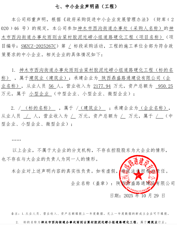 四、主要标的信息合同包1(雨则古梁村胶泥圪崂小组道路硬化工程): 工程类(陕西鼎盛路通建设有限公司)