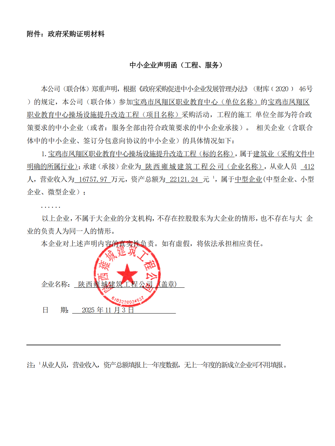 公告概要:| 公告信息: |  | 采购项目名称 | 凤翔区职业教育中心操场设施提升改造工程 |  | 品目 |  |  | 采购单位 | 宝鸡市凤翔区职业教育中心 |  | 行政区域 | 凤翔县 | 公告时间 | 2025年11月03日  17:11 |  | 评审专家(单一来源采购人员)名单 | 宁元涛,罗永生,魏建文 |  | 总成交金额 | ¥36.855000 万元(人民币) |  | 联系人及联系方式: |  | 项目联系人 | 赵瑶 |  | 项目联系电话 | 15891199228 |  | 采购单位 | 宝鸡市凤翔区职业教育中心 |  | 采购单位地址 | 宝鸡市凤翔区柳林镇柳汉路 |  | 采购单位联系方式 | 0917-8925463 |  | 代理机构名称 | 陕西中霖智达工程咨询有限公司 |  | 代理机构地址 | 陕西省宝鸡市金台区金台大道金融广场C座1810室 |  | 代理机构联系方式 | 15891199228 |  | 附件: |  | 附件1 | 中小企业声明函.png |