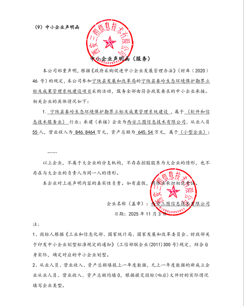 一、项目编号:DQZY2025-GK068 二、项目名称:宁陕县秦岭生态环境保护勘界立标及成果管理系统建设项目 三、采购结果   采购包1:     | 供应商名称  | 供应商地址  | 中标(成交)金额  | 评审总得分  |      | 西安三图信息技术有限公司  | 西安市高新区高新四路亮丽综合楼1栋1单元29层12904号房  |  6,471,100.28元   | 91.20  |          四、主要标的信息  合同包1(宁陕县秦岭生态环境保护勘界立标及成果管理系统建设项目):      服务类(西安三图信息技术有限公司)     | 品目号  | 品目名称  | 采购标的  | 服务范围  | 服务要求  | 服务时间  | 服务标准  | 金额(元)  |      | 1  | 生态资源调查与监测服务  | 技术服务  | 宁陕县秦岭生态环境保护勘界立标及成果管理系统建设项目(详见招标文件)  | 满足招标文件及采购人要求  | 自合同签订之日起9个月  | 满足招标文件及采购人要求  | 6,471,100.28  |             五、评审专家(单一来源采购人员)名单:  六、代理服务收费标准及金额:     | 代理服务收费标准及金额  |  以中标金额为基数,参照国家计委颁布《招标代理服务收费管理暂行办法》(计价格〔2002〕1980号)和国家发展和改革委员会办公厅颁发的《关于招标代理服务收费有关问题的通知》(发改办价格〔2003〕857号)文件规定执行。     |      | 合同包号  | 合同包名称  | 代理服务费金额(万元)  | 收取对象  |    | 1  | 宁陕县秦岭生态环境保护勘界立标及成果管理系统建设项目  | 5.362  | 中标(成交)供应商  |        七、公告期限 自本公告发布之日起1个工作日。  八、其他补充事宜  九、凡对本次公告内容提出询问,请按以下方式联系。  1.采购人信息 名称:宁陕县发展和改革局  地址:陕西省安康市宁陕县城关镇民安路9号  联系方式:0915-6822151  2.采购代理机构信息 名称:陕西大秦正源项目管理有限公司  地址:陕西省安康市高新技术开发区居尚社区10号楼一单元303室  联系方式:15929456696  3.项目联系方式  项目联系人:杨慧  电话:15929456696    陕西大秦正源项目管理有限公司  2025年11月04日                                           |