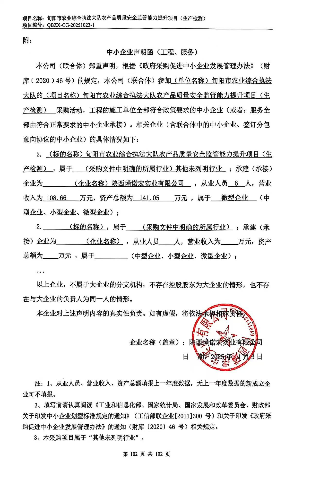 公告概要:| 公告信息: | | 采购项目名称 | 农业综合执法大队农产品质量安全监管能力提升项目(生产检测) | | 品目 | | | 采购单位 | 旬阳市农业综合执法大队 | | 行政区域 | 旬阳县 | 公告时间 | 2025年11月05日 11:45 | | 评审专家(单一来源采购人员)名单 | 刘鹏,张小安,邹广群 | | 总成交金额 | ¥14.830000 万元(人民币) | | 联系人及联系方式: | | 项目联系人 | 吴承鑫 徐斯璐 | | 项目联系电话 | 15509293000 | | 采购单位 | 旬阳市农业综合执法大队 | | 采购单位地址 | 旬阳市健康南路94号院 | | 采购单位联系方式 | 17392411222 | | 代理机构名称 | 陕西秦巴智信项目管理有限公司 | | 代理机构地址 | 旬阳市城关镇鲁家台社区瑞莲小区2-2-302 | | 代理机构联系方式 | 15509293000 | | 附件: | | 附件1 | 旬阳市农业综合执法大队农业综合执法大队农产品质量安全监管能力提升项目(生产检测)中标(成交)明细.pdf | | 附件2 | 磋商文件.doc | | 附件3 | 中小企业声明函.jpg |