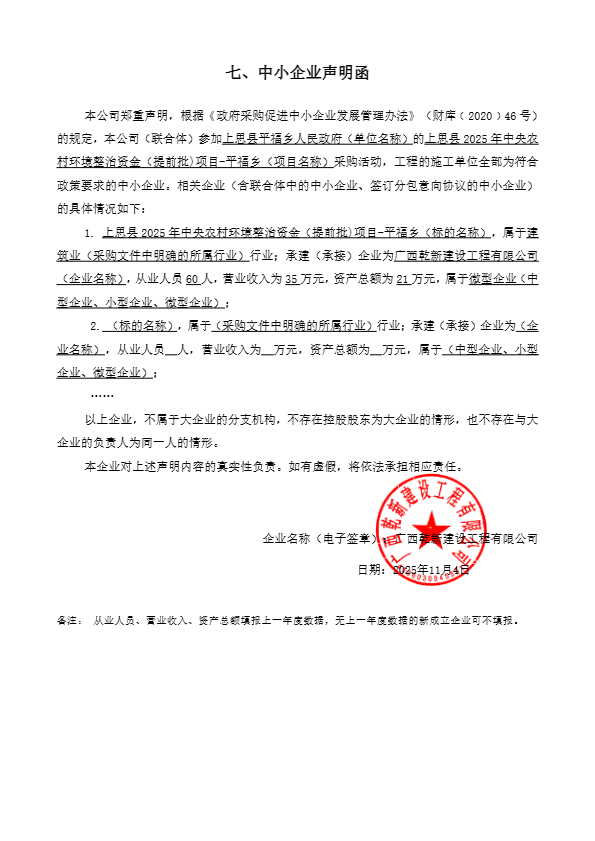 2.废标结果: 四、主要标的信息 工程类主要标的信息: | 序号 | 标项名称 | 标的名称 | 施工范围 | 施工工期 | 项目经理 | 执业证书信息 | | 1 | 上思县2025年中央农村环境整治资金(提前批)项目-平福乡 | 上思县2025年中央农村环境整治资金(提前批)项目-平福乡 | 农村生活污水处理项目污水处理、综合管网、建筑安装及园林工程,具体详见施工图纸及工程量清单。 | 40日历天 | 古素漪 | 桂245131549005 | 五、评审专家(单一来源采购人员)名单: 李培铭(第1分标采购人代表),卢远艺,朱芳宜 六、代理服务收费标准及金额: 1.代理服务收费标准:按采购文件规定的收费计算标准(工程类)采用差额定率累进法计算出收费基准价格,由成交人在领取成交通知书时一次性向采购代理机构支付。 2.代理服务收费金额(元):6280 七、公告期限 自本公告发布之日起1个工作日。 八、其他补充事宜 1.供应商认为成交结果使自己的权益受到损害的,可以在知道或者应知其权益受到损害之日起7个工作日内,以书面形式向采购人/采购代理机构提出质疑。 2.网上查询地址:中国政府采购网、广西壮族自治区政府采购网、全国公共资源交易中心(广西·防城港)。 3.成交供应商评审总得分:81.20分。 4.监督部门:上思县政府采购中心;联系电话:0770-8521708。 九、对本次公告内容提出询问,请按以下方式联系 1.采购人信息 名 称:上思县平福乡政府 地 址:防城港市上思县平福乡平福圩200号 联系方式:0770-8312131 2.采购代理机构信息 名 称:广西善就项目管理咨询有限公司 地 址:防城港市防城区文昌街道城南村五区安置点E7#1-5号 联系方式:0770-3397197 3.项目联系方式 项目联系人:韦军良 电 话:0770-3397197 附件信息: |