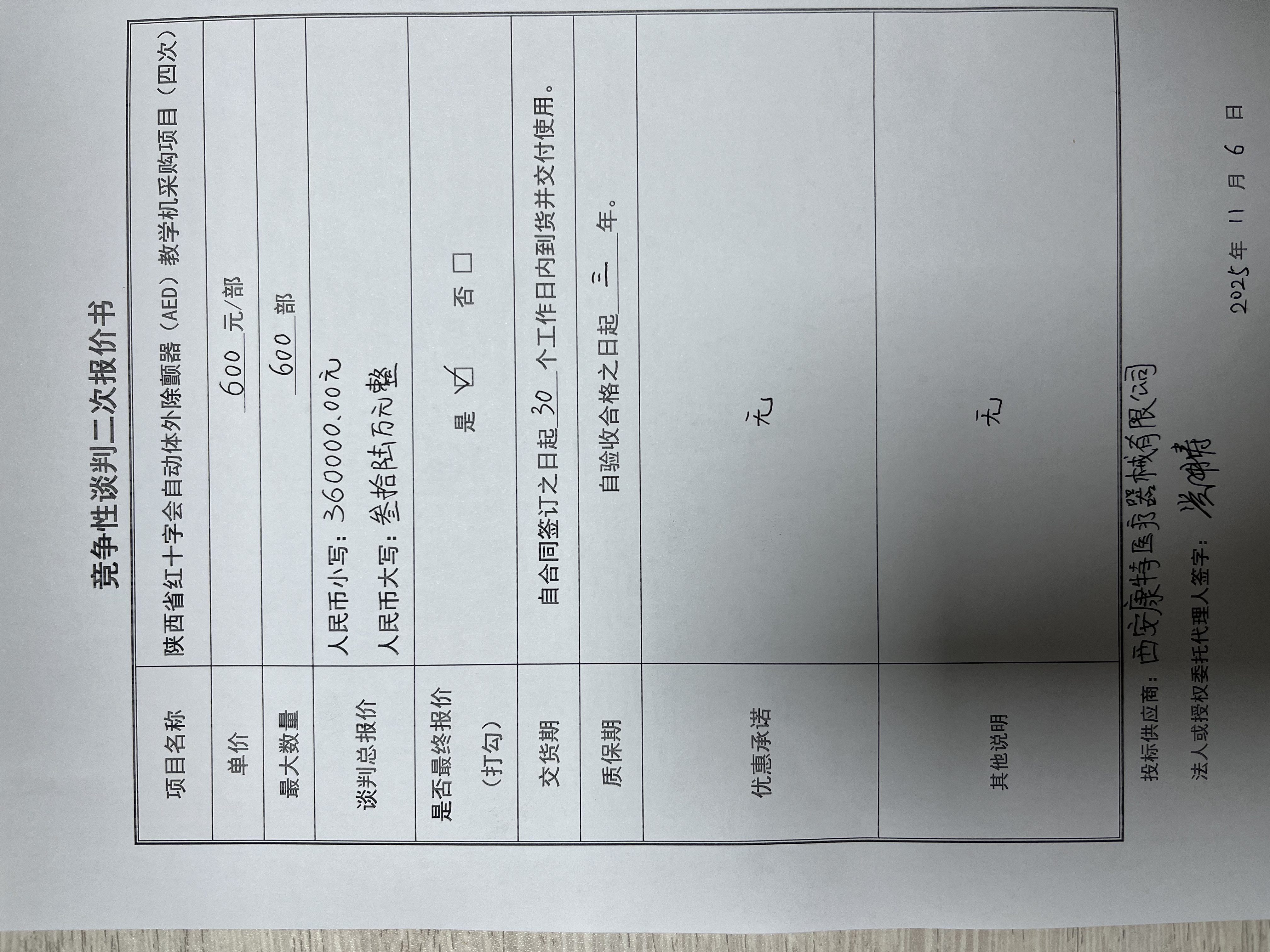 一、项目编号:ZJCG2025-09-01-03二、项目名称:陕西省红十字会自动体外除颤器(AED)教学机采购项目(四次)三、采购结果采购包1: