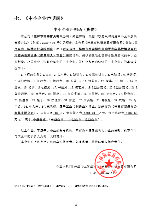 | 24 | 桂林市社会福利院购置老年养护楼项目启用相关设施设备(家具用具)项目 | 办公桌椅 | 新晟 | 办公桌规格(mm):长1400×宽700×高760,办公椅规格(mm):长450×宽460×高900,型号:定制。 | 3 | 2300 |