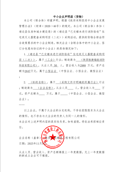 四、主要标的信息合同包1(靖边县“已交楼未进行消防验收”住宅类灭火器配套采购项目): 货物类(陕西吉乾建设工程有限公司)