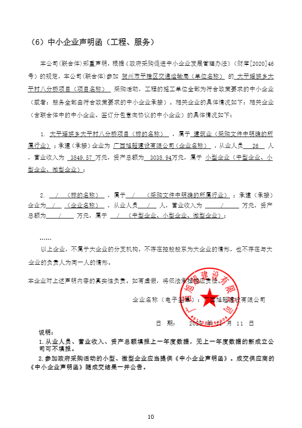 2.废标结果: 四、主要标的信息 工程类主要标的信息: | 序号 | 标项名称 | 标的名称 | 施工范围 | 施工工期 | 项目经理 | 执业证书信息 | | 1 | 大平瑶族乡大平村八分桥项目 | 大平瑶族乡大平村八分桥项目 | 项目位于大平乡大平村,起点 K0+000.000位于大平乡大平村八分冲路口附近与旧路相接,终点 K0+095.404 位于河流对岸水泥路上,总里程 0.095 公里,其中桥长0.020公里,临时道路长75m等。具体详见工程量清单和图纸要求范围内所有工程内容。 | 以开工令为准,工期为180日历天。 | 刘敏敏 | 桂245222200563 | 五、评审专家(单一来源采购人员)名单: 黄定基,邹爱群(第1分标采购人代表),王向平 六、代理服务收费标准及金额: 1.代理服务收费标准:根据国家发改办【2003】857号文,代理服务费由成交单位交纳,含在磋商报价内,代理服务费金额按国家计委计价格【2002】1980号文规定的“招标代理服务收费标准”执行。 2.代理服务收费金额(元):15147.85 七、公告期限 自本公告发布之日起1个工作日。 八、其他补充事宜 1.本次公告同时在中国政府采购网、广西壮族自治区政府采购网、全国公共资源交易平台(广西贺州)发布。 2.成交供应商评审总得分:91.00分 3.监督部门: 贺州市平桂区政府采购管理办公室,联系电话: 0774-8832896。 4.被否决投标的供应商名称、否决原因及依据:无 九、对本次公告内容提出询问,请按以下方式联系 1.采购人信息 名 称:贺州市平桂区交通运输局 地 址:贺州市平桂区平桂大道1号发展大厦A座 联系方式:0774-8832853 2.采购代理机构信息 名 称:广西昌海项目管理有限公司 地 址:贺州市八步区城东新区安置回建地C地块152号 联系方式:18777408502 3.项目联系方式 项目联系人:何丽丽 电 话:18777408502 附件信息: |